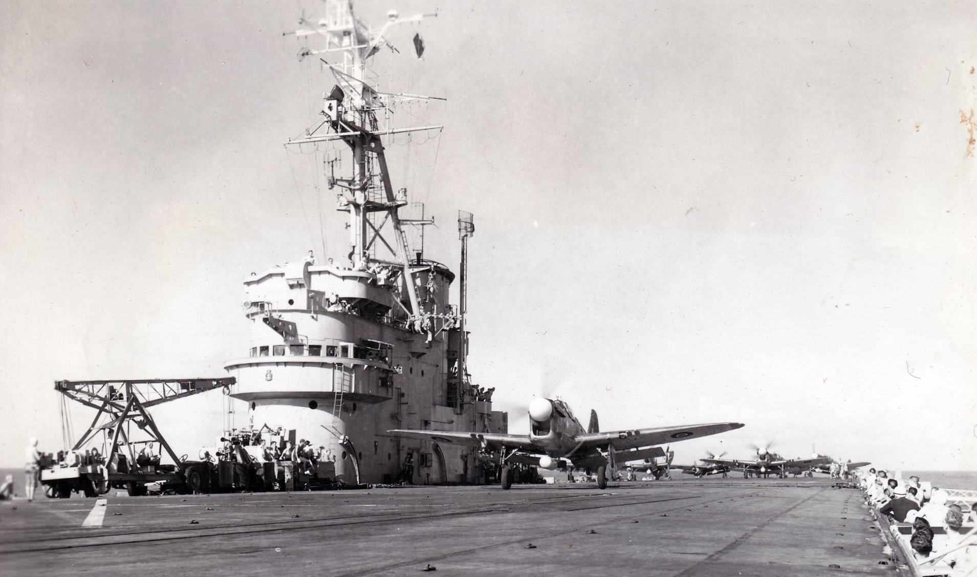 HMCS Warrior, turned into the wind to launch Firefly squadrons, 1947.