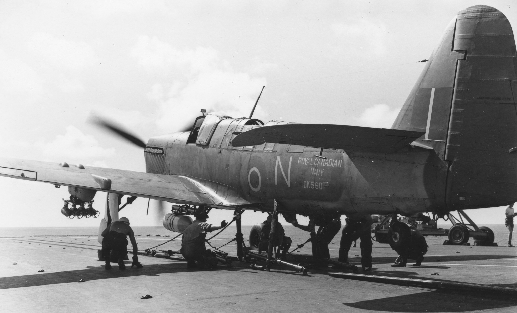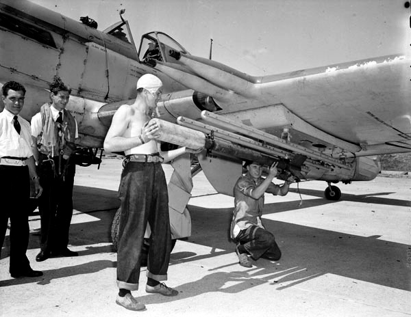 Faiery Firefly Mk. I being loaded with 3-inch rockets armed with a 60-lb practice warhead head, RCN, 4 May 1949.