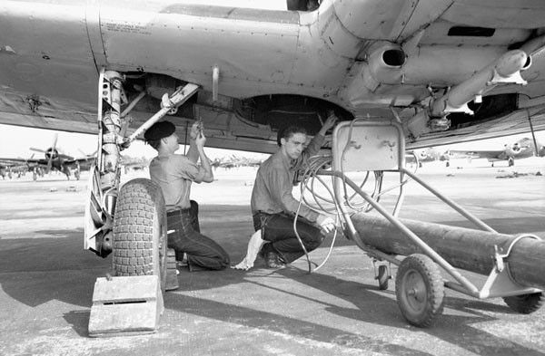 Air mechanics replenishing oxygen supply of Fairey ‘Firefly’ F.R.I aircraft of the 18th Carrier Air Group, R.C.N. (Left to right): T. Morton, G. Burr, 26 August 1949.