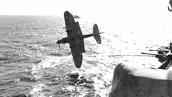 This is what happens when a pilot gets a last second wave-off to his landing on HMCS Magnificent. In those days, before the angled flight deck was developed by the Royal Navy, an aircraft on approach to the flight deck was with power off. If it got a wave-off, the pilot had to ram the throttle wide open which could create a “torque stall” which is what was going on with the Firefly in the photo. In other words, the pilot had no control over the aircraft and as you can see in the second photo, he ended up in the drink. The pilot was rescued by the escorting destroyer acting as “plane guard”. Later on, helicopters were used as plane guards . . . much less expensive. (Larry Vipond)