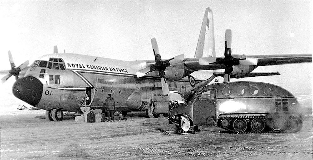 Lockheed C-130B Hercules (Serial No. 10301), Resolute Bay or CFS Alert, with a Bombardier B-12 Snow Coach c1960s (Red Ensign era).