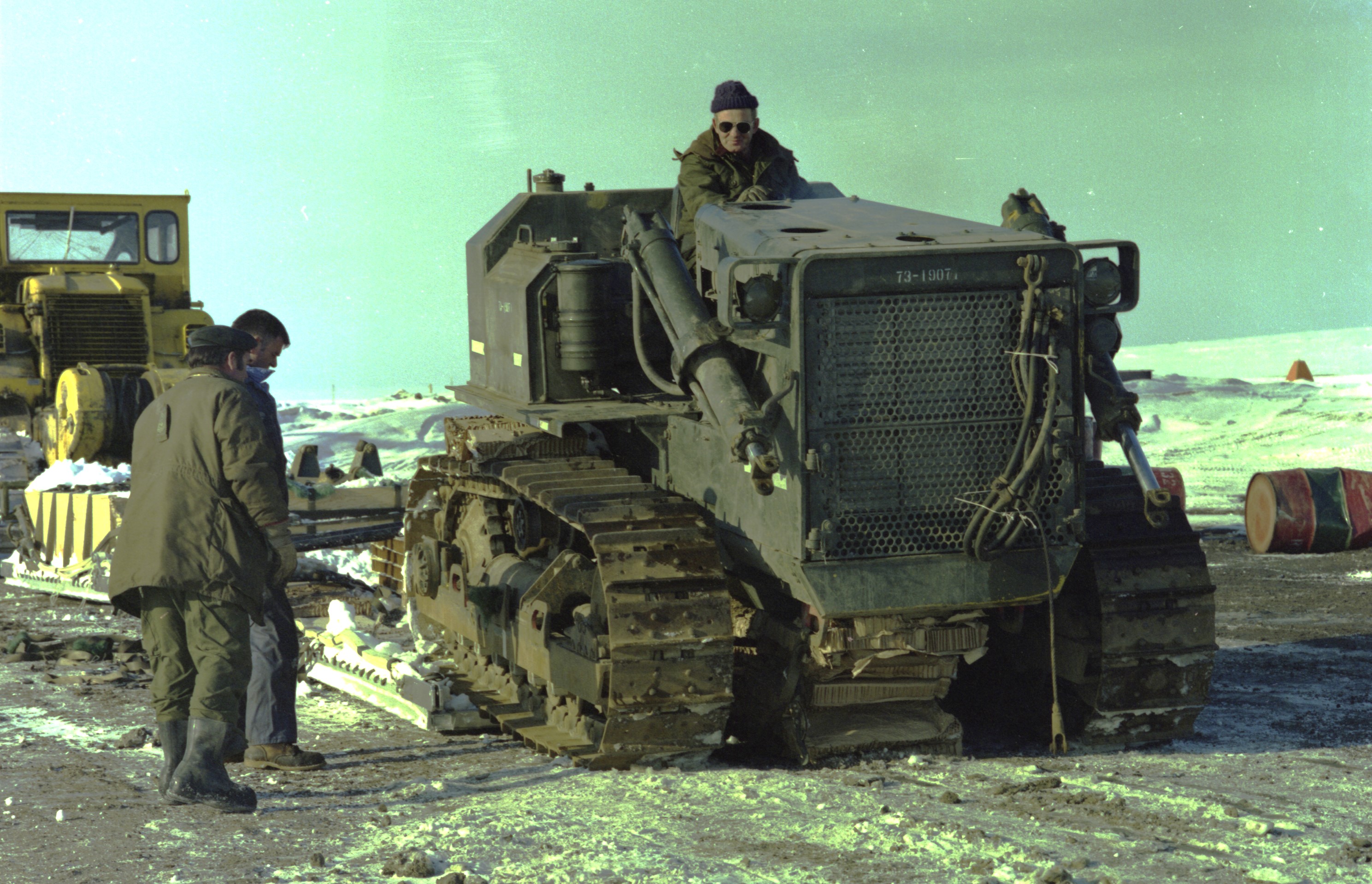 Bulldozer off-loading from a pallet after a low-altitude parachute extraction (LAPES) drop from a Hercules, May 1977.