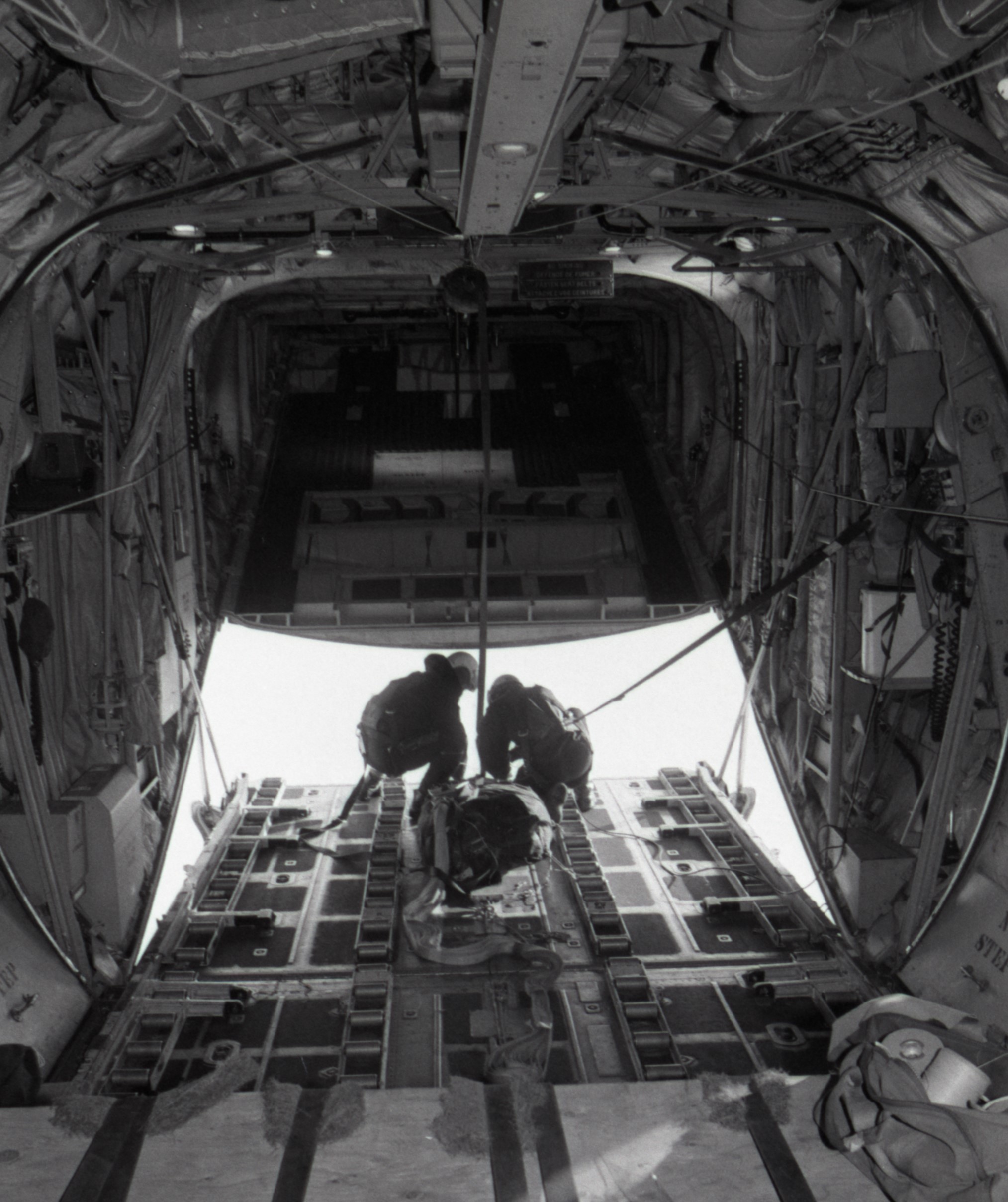 I loved standing on the ramp waiting for the green light to jump, and as the ramp was being lowered When the ramp opened it was like watching a barn door opening in front of you. The view was even more interesting when we had two other Hercules in trail formation following us to the drop zone, and on static line jumps you could make out the other two aircraft pulling up alongside in V formation so we could all exit at the same time – very rare if ever done these days. As I stepped off the ramp I could see the other jumpers exiting the aircraft on either side – then the canopy was open and there was other business to take care of. On a Canadian Airborne Regiment training exercise over CFB Borden, Ontario in 1987 we had twelve Hercules carrying more than 600 paratroopers dropped by static line in four three-plane waves with weapons and equipment. We did a combat extraction two hours later – aircraft came in to land, taxied to the end of the runway and turned slowly around. You jumped onboard by group, and if you missed the plane as it turned around, it took off without you and there was a 25 km hike north to a vehicle pickup point. Needless to say, everyone was on board after the tenth plane came in and the other two came back to Petawawa empty. You are unlikely to see that again in Canada in the near future.