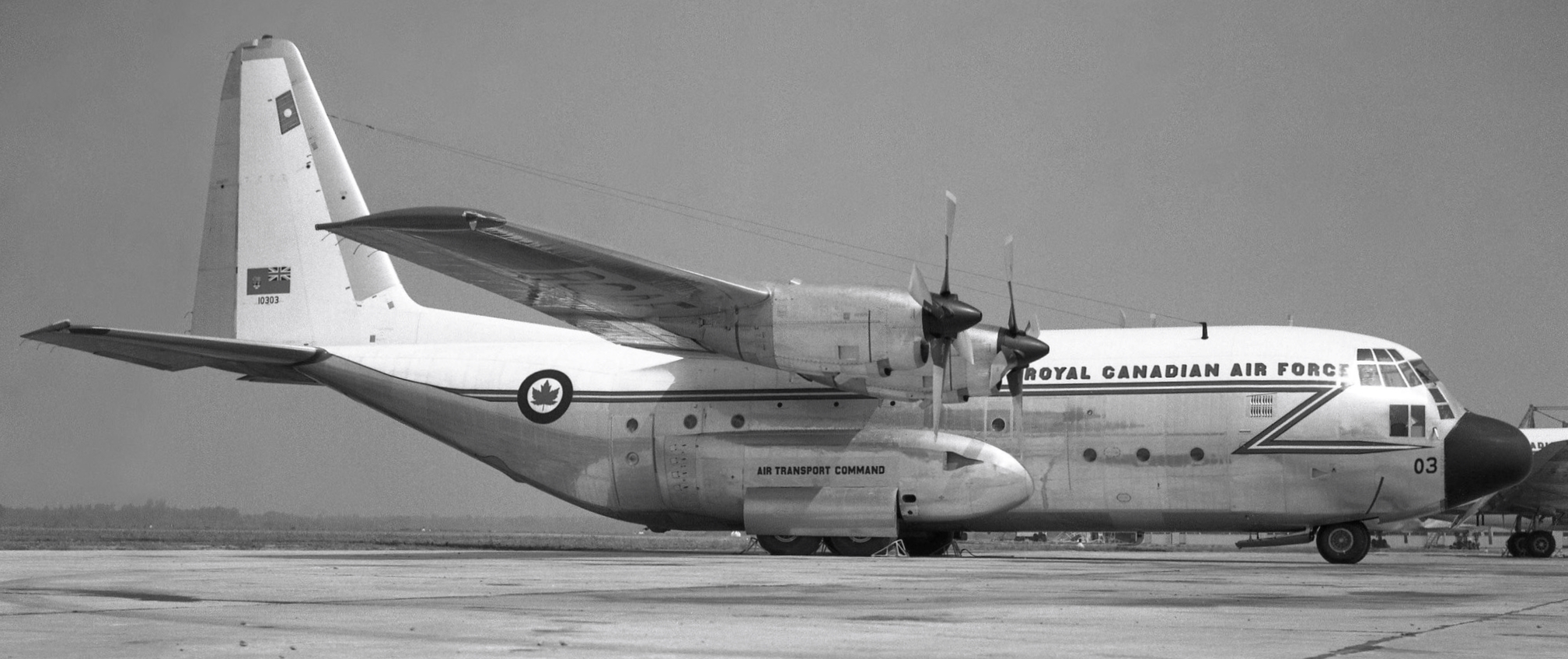 Lockheed CC-130B Hercules, RCAF (Serial No. 10303), c1966. Ex USAF 60-5452. Delivered new to 435 (T) Squadron, RCAF Station Namao, Alberta, November 1960. Took part in Operation Boxtop VII, resupply of Alert from Thule, August 1962. Operating to Europe by fall of 1962, in support of RCAF units there. Used by 408 Squadron at Rivers Camp, Manitoba from 1965 or 1966. Returned to Lockheed on 31 March 1967, to civil register as N4654 on 7 July 1967, then to Columbian AF as FAC-1002 in January 1969. Crashed and burned at Bogota, Columbia on 8 August 1969. (CASPIR)