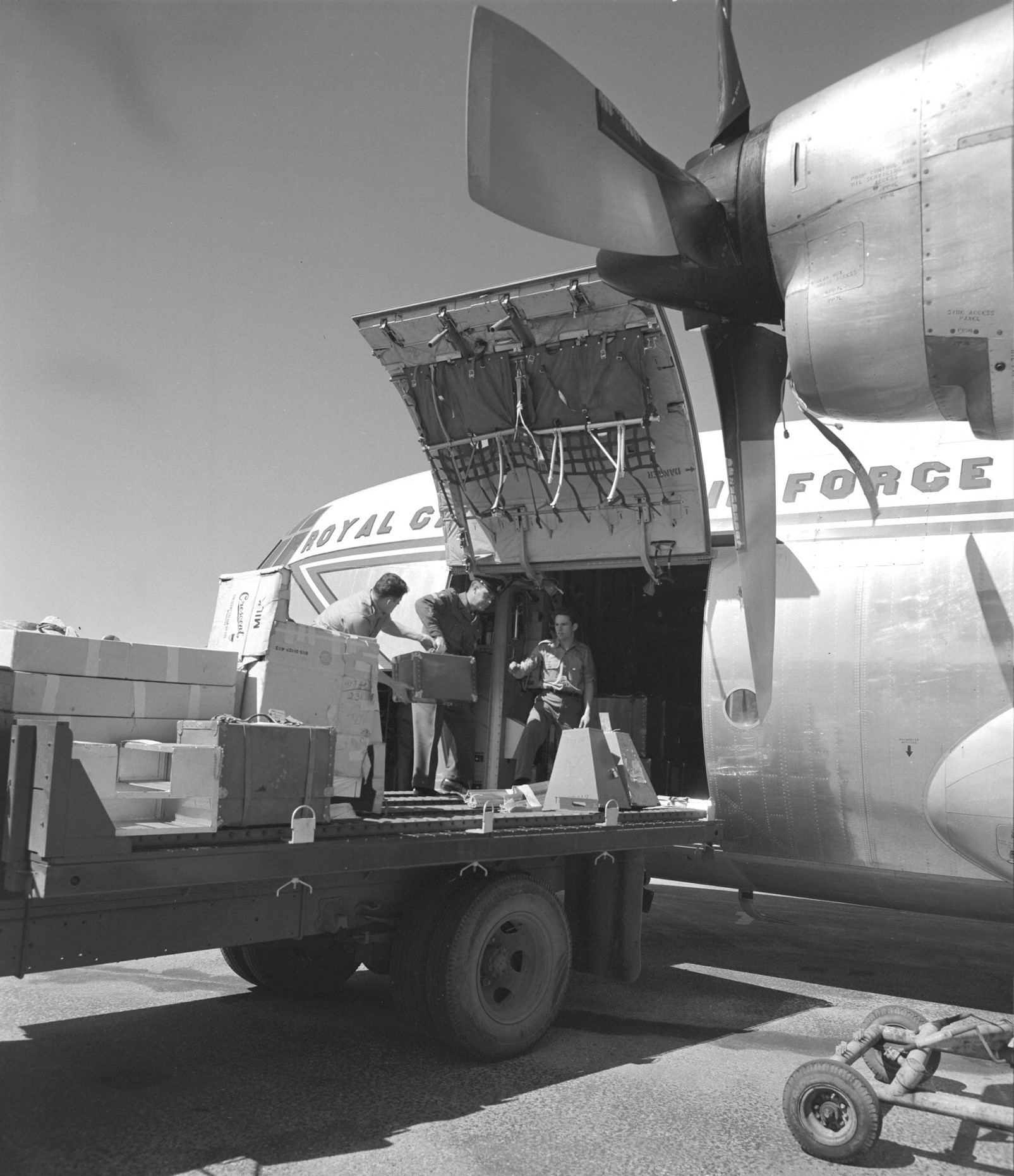 Canadair CL-13 Sabre wings being unloaded from an early Lockheed CC-130B Hercules (Serial No. 10302), RCAF Station Trenton in the 1960s.