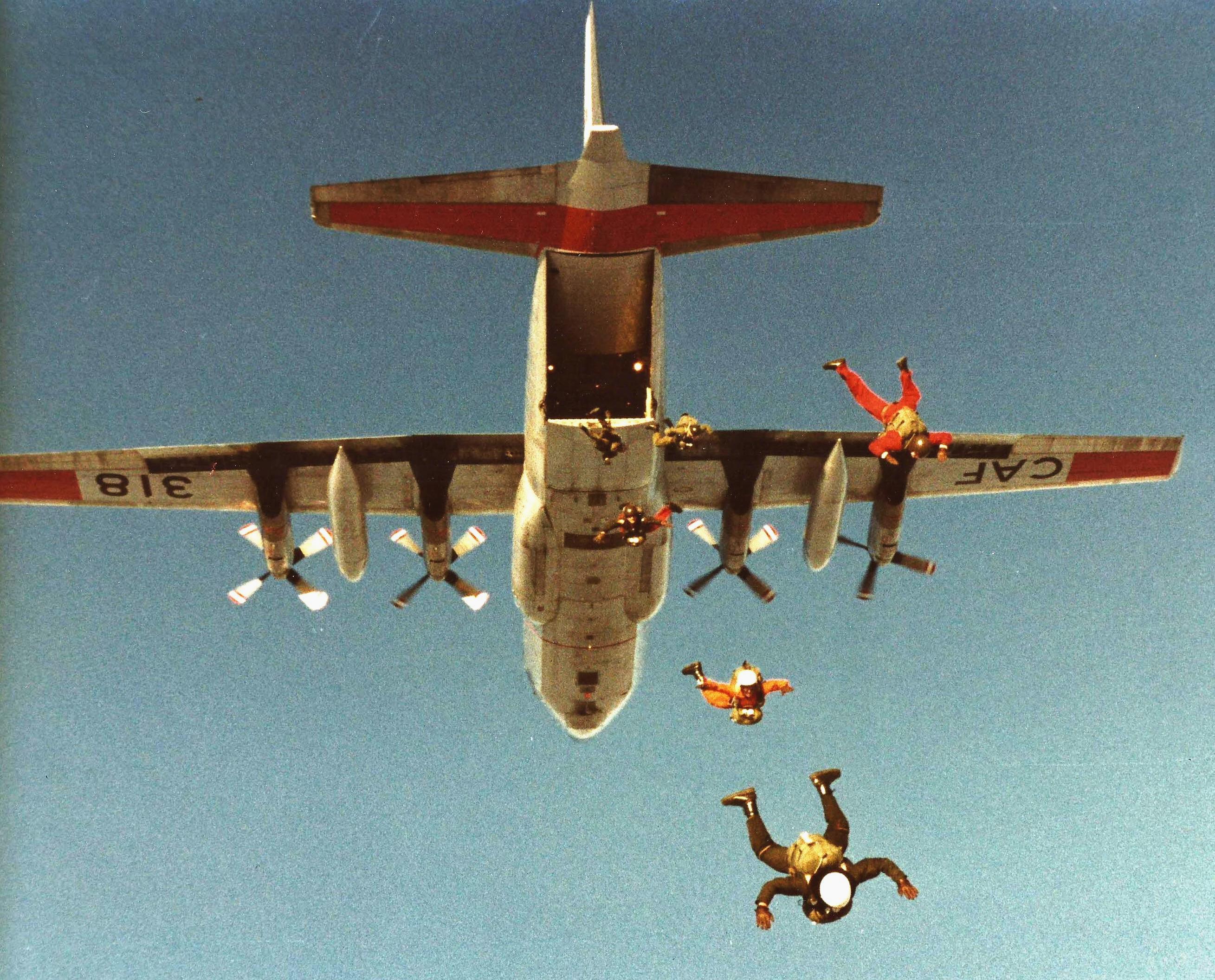 Lockheed CC-130E Hercules, view of Canadian Army Military Freefall Parachutists (MFP) exiting with full equipment, ca 1979.