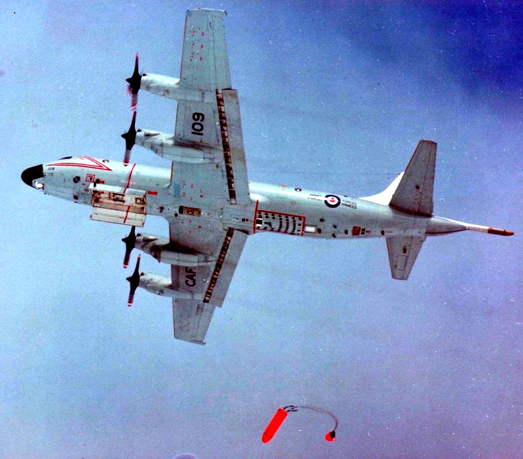 Lockheed CP-140 Aurora (Serial No. 140109), dropping a Survival Kit Air Droppable (SKAD). Note bomb bay doors are open and the external sono launch tubes have a red line around their outer perimeter, aft of the wing.