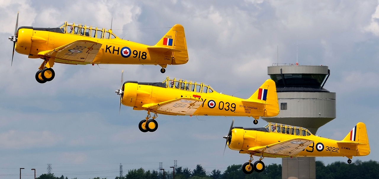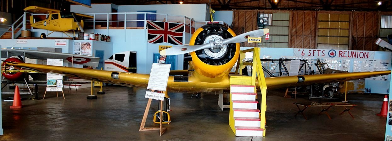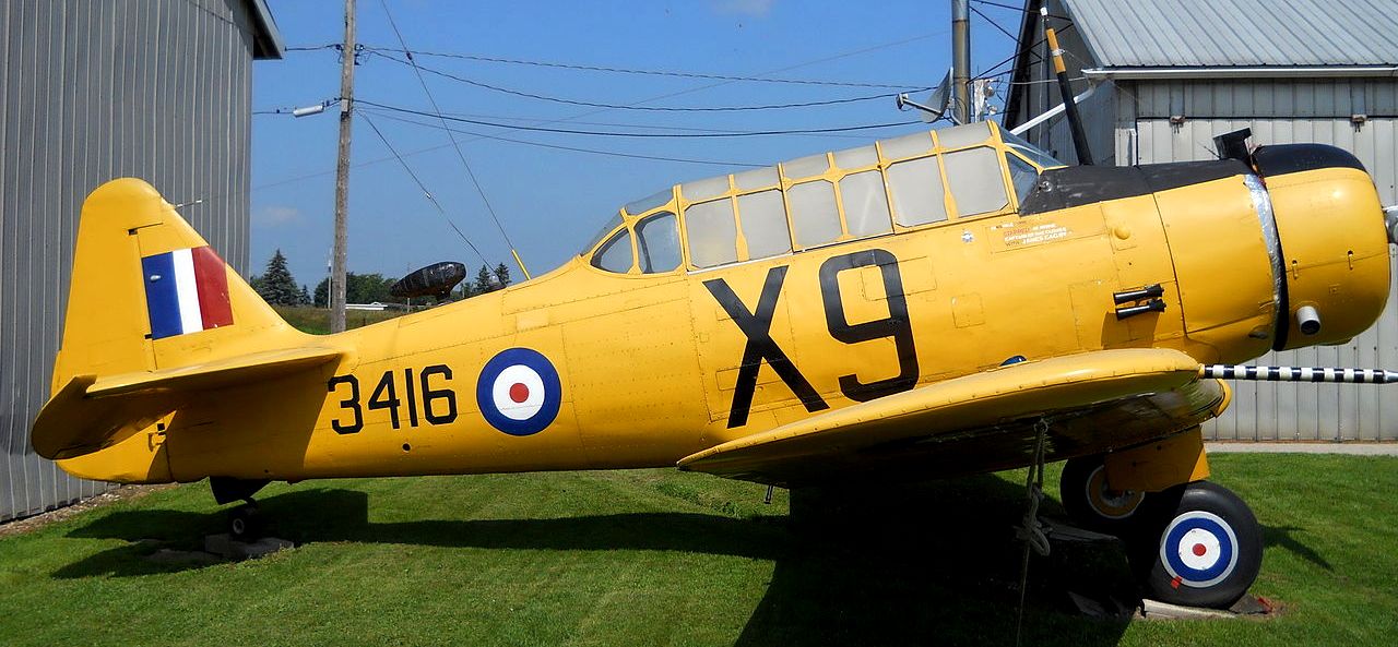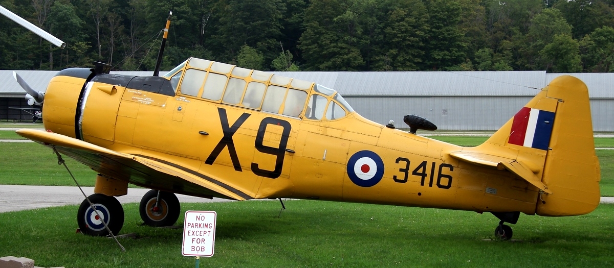North American NA-64 Yale W/T(Serial No. 3416), Wireless Trainer. It served with the RCAF No. 4 Wireless School Flying Squadron and suffered a groundloop accident at St. Catharines on 29 May 1944. This Yale was flown by actor James Cagney in the 1942 film “Captains of the Clouds”. It is preserved with No. 6 RCAF Dunnville Museum.