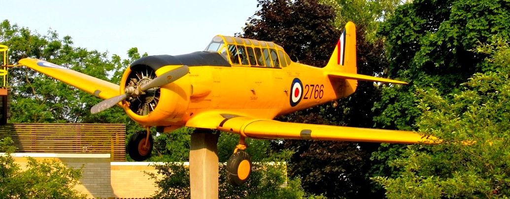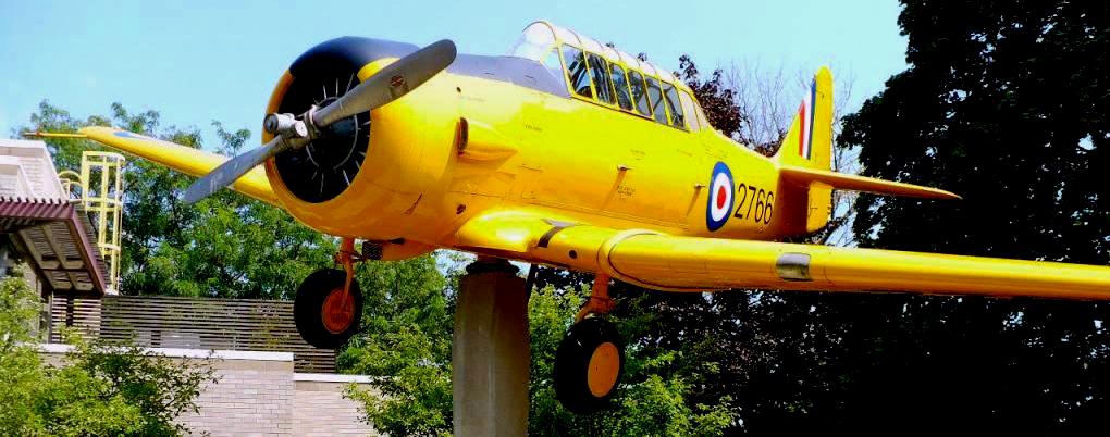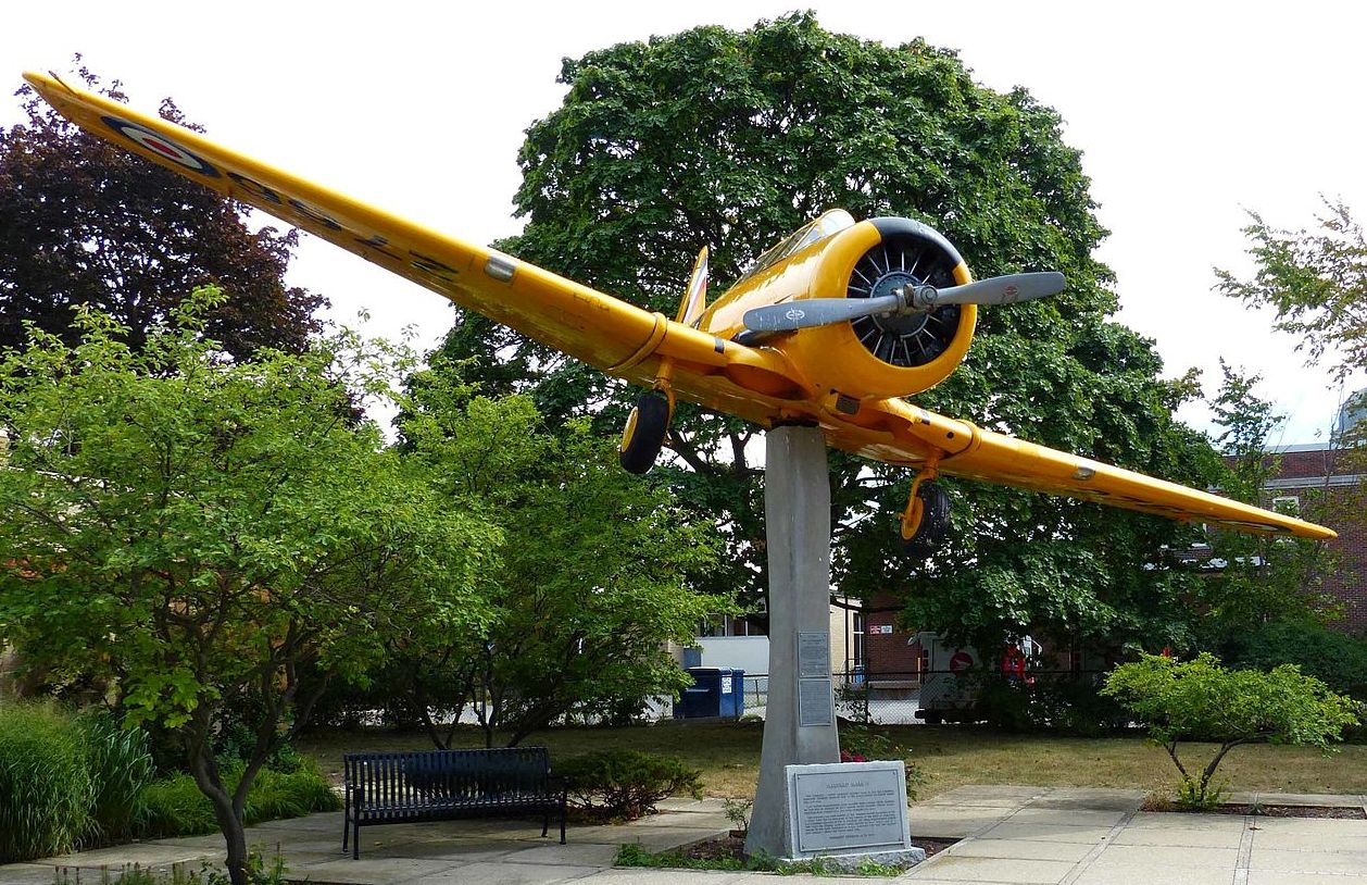 North American NA-66 Harvard Mk. II, RCAF (Serial No. 2766), C/N 66-2499. This Harvard is mounted on a pylon as a memorial to No. 6 Service Flying Training School, in front of the public library, Dunnville, Ontario, Canada. The memorial was erected by the surviving graduates of No. 6 SFTS.