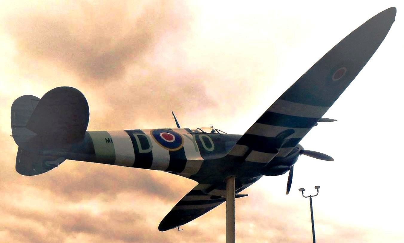 Supermarine Spirtfire Mk. IX replica (Serial No. ML135), painted in the markings of an aircraft flown by local pilot Jerry Billings during the Second World War. It is mounted on a pylon in Spitfire Park.