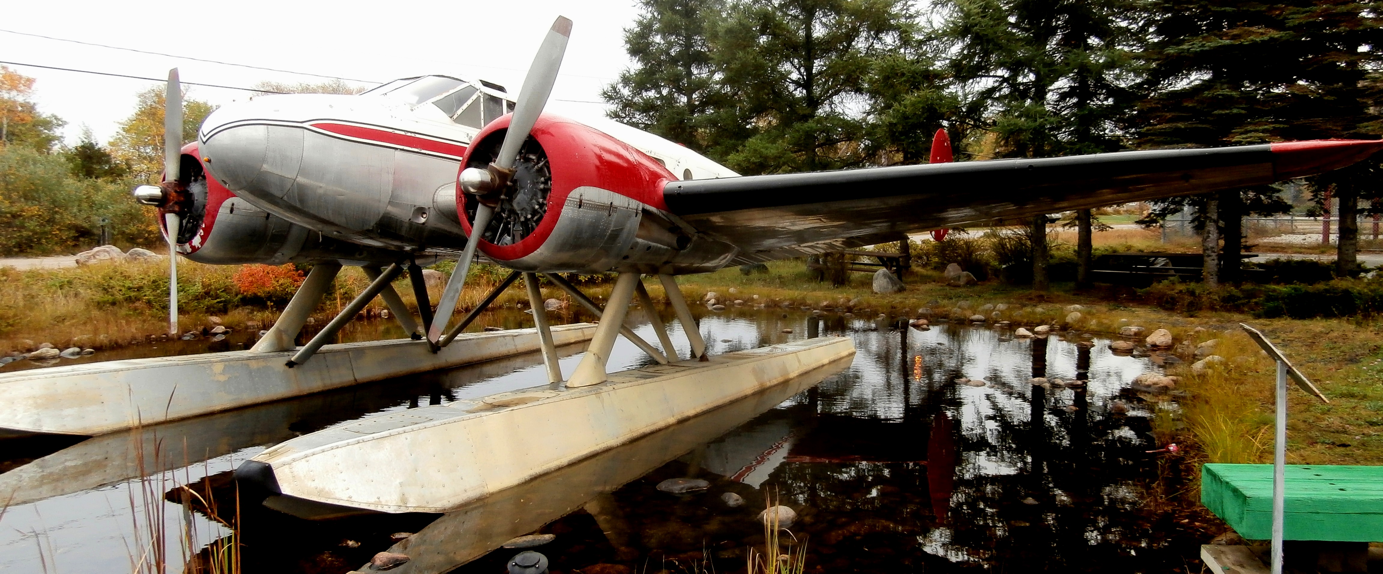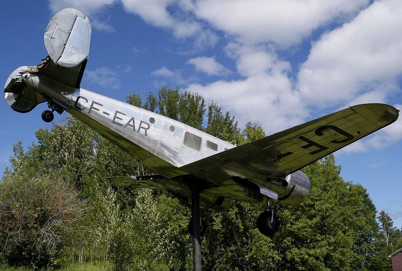Beechcraft C-45 Expeditor Mk. 3NM, CA-22, (Serial No.). This aircraft was built from the parts of three planes and erected here on false floats in 1995. The original aircraft, CA-22 3NM, was built in 1952 and assigned to the Royal Canadian Air Force. Hwy 17 and East St.