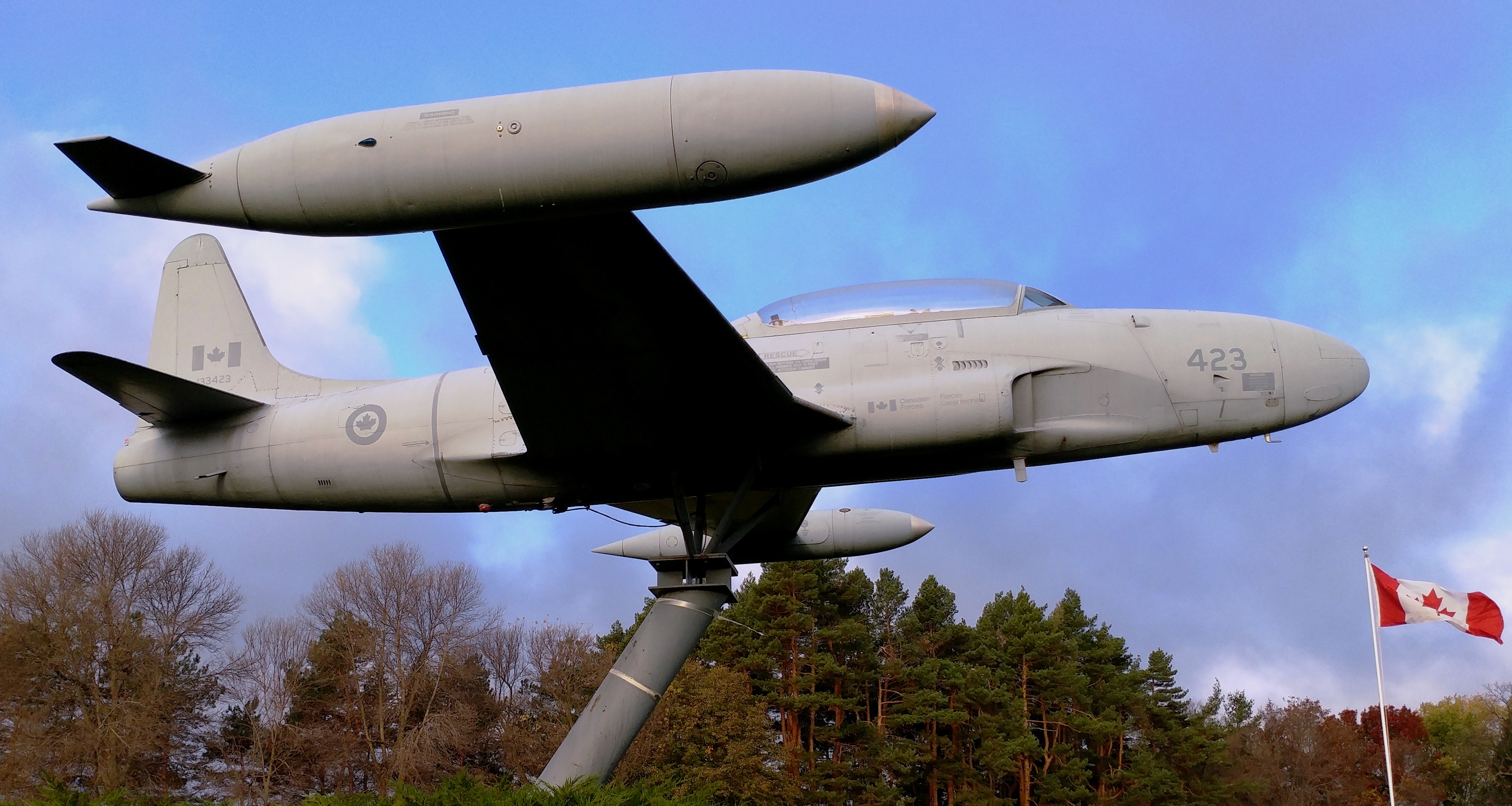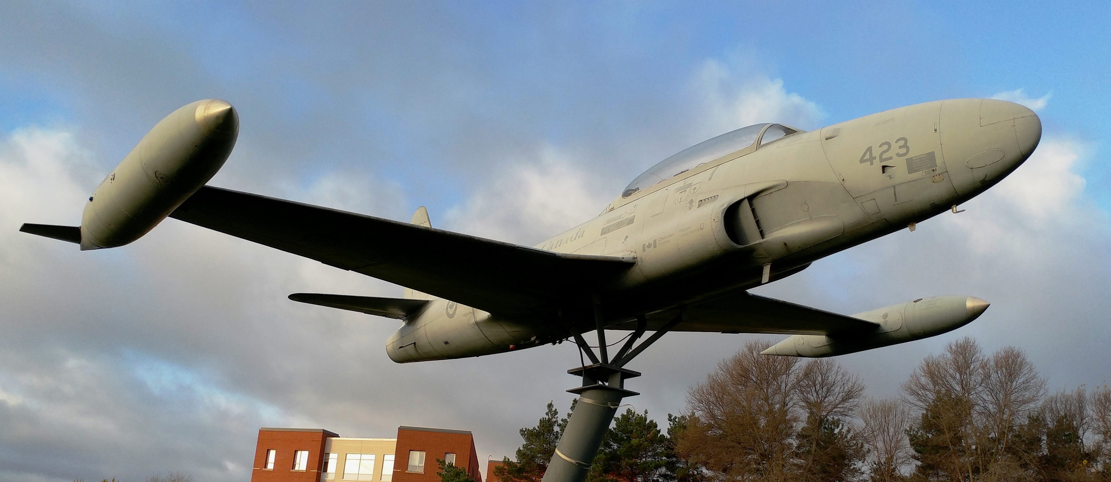 Canadair CT-133 Silver Star (Serial No. 133423), (Serial No. 21423), 423, camouflage, mounted on a pylon at the Nav Canada Training Centre.