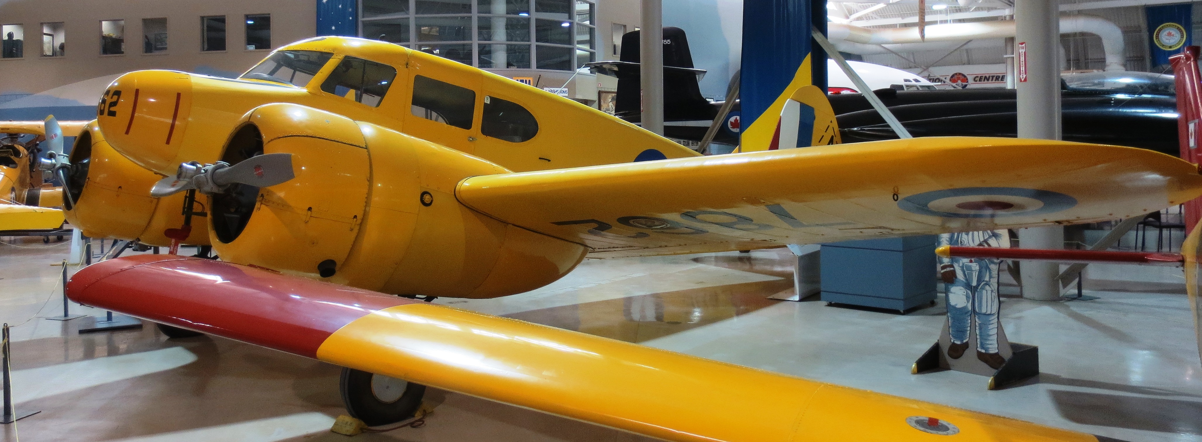 Avro 652A Anson Mk. V-P (Serial No. 12417), BRC 1567, CF-HOT.  The CWHM’s Anson was built by MacDonald Brothers in Winnipeg in 1944.  It flew with RCAF No. 7 Photographic Wing and No. 414 Squadron in Ottawa on photo survey work until the late 1940s.  In 1956, it was purchased by INCO and used for mineral surveying until 1980, when it was donated to the Museum.  The Anson is now rigged internally as a navigation trainer, which was its primary role in the British Commonwealth Air Training Plan (BCATP).  It is painted in the yellow colour common to all BCATP trainers and carries its wartime RCAF markings.  (CWHM)