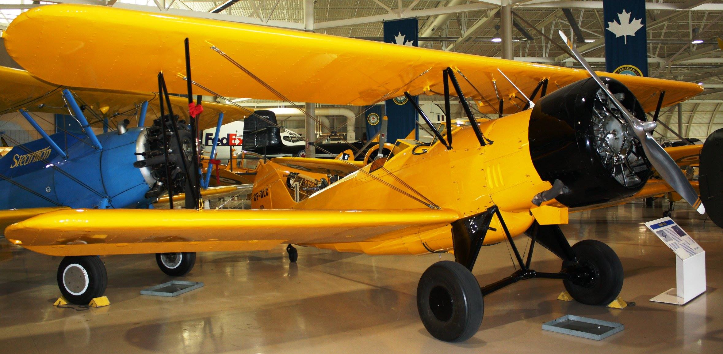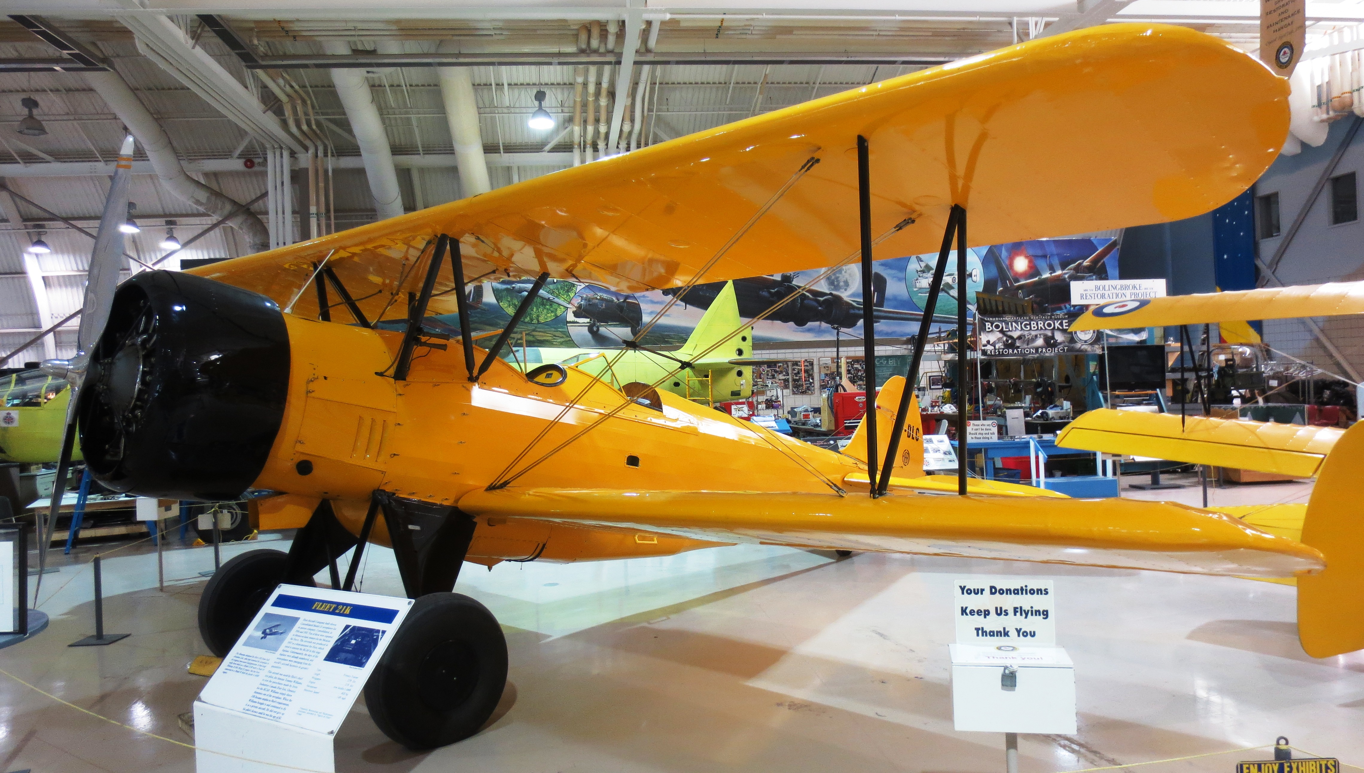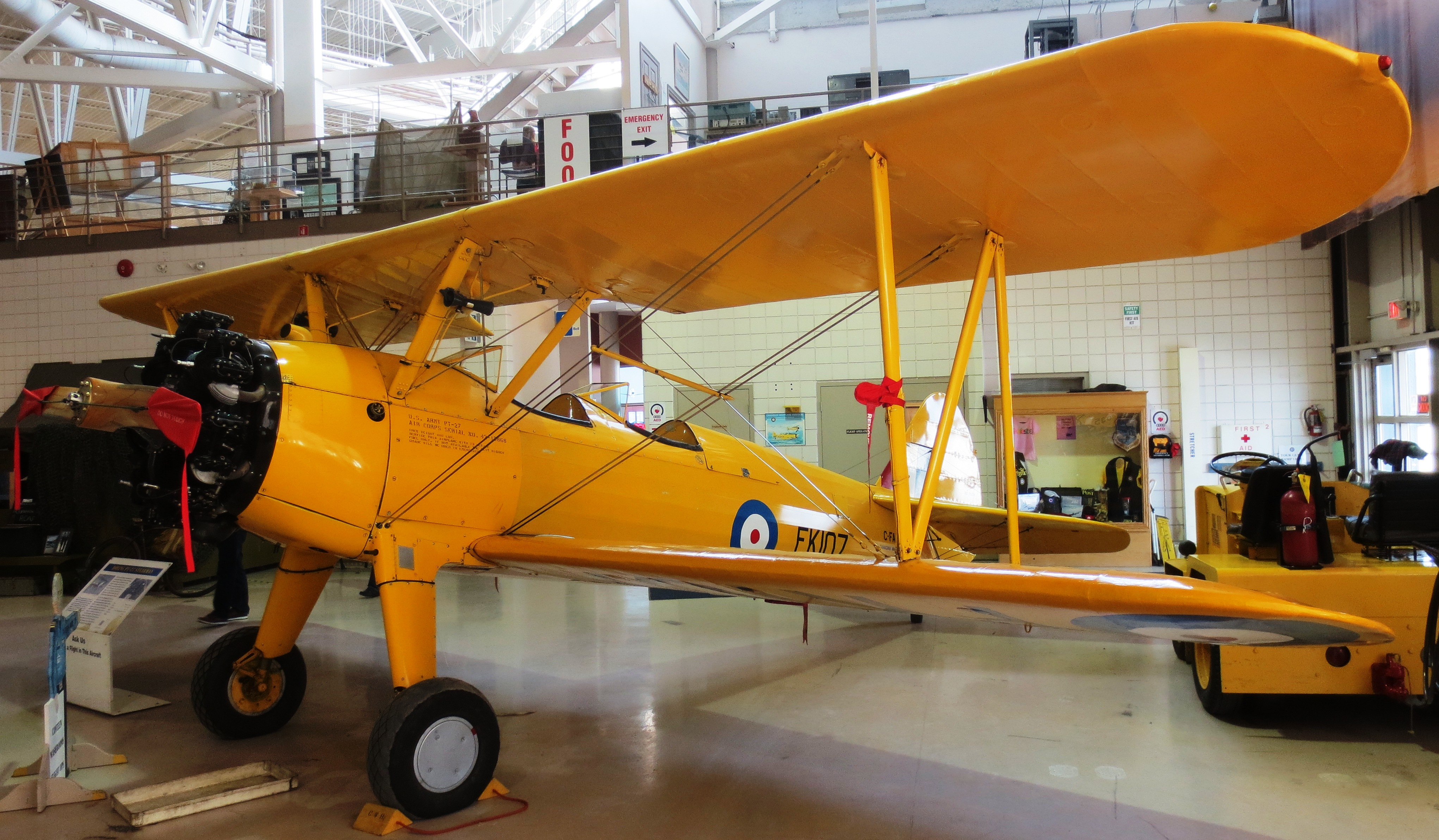 Boeing Stearman A75N1/PT-17 Kadet (Serial No. 41-8621), C/N 75-2180, painted as RCAF (Serial No. FK107), Reg. No. C-FAIU.  This aircraft was donated to the CWHM by Bob Hill in 1986.  It is painted in the colours of the last PT-17 delivered to the BCATP.  It was built at Wichita, Kansas in 1942.  (CWHM)