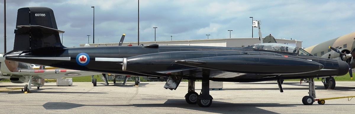Avro CF-100 Canuck Mk. 5D (Serial No. 100785), previously (Serial No. 18785).  This aircraft was manufactured in 1958 as a Mk. 5 and was one of the last batch produced.  Built as an all weather interceptor, it was later converted into a Mk. 5D electronic counter measures (ECM) aircraft and used for the realistic simulation of enemy aircraft during NORAD exercises.  The aircraft is fitted with wingtip fuel tanks instead of rocket pods to extend its range for ECM duties.  It served in an electronic warfare role with No. 414 Black Knight squadron in North Bay, Ontario until December 1981.  It made its last flight on 10 Feb 1982, when it was delivered to the Canada Aviation and Space Museum in Ottawa.  It is has been painted black to resemble the prototype CF-100, (Serial No. 18101), and is on extended loan from the Canada Aviation and Space Museum.  (CWHM)