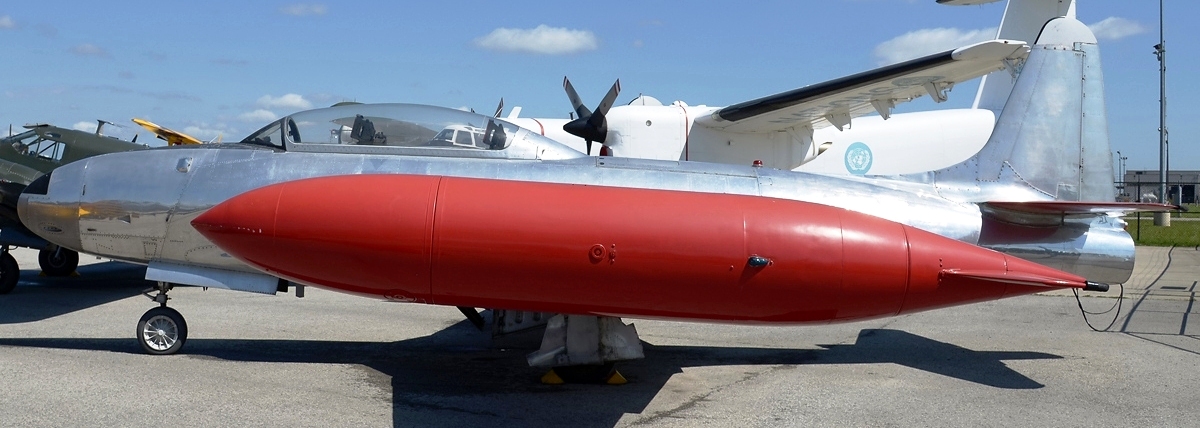 Canadair CT-133 Silver Star RCAF (Serial No. 21275), c/n T-33-275, currently painted as 133275, Silver.  The CWHM’s aircraft is one of 658 produced in Canada.  It was acquired from the Dept of National Defence in late 1995.  It had been a support aircraft for the “Snowbirds” aerobatic team, based at No. 2 Flying Training School, Moose Jaw, Saskatchewan.  (CWHM)