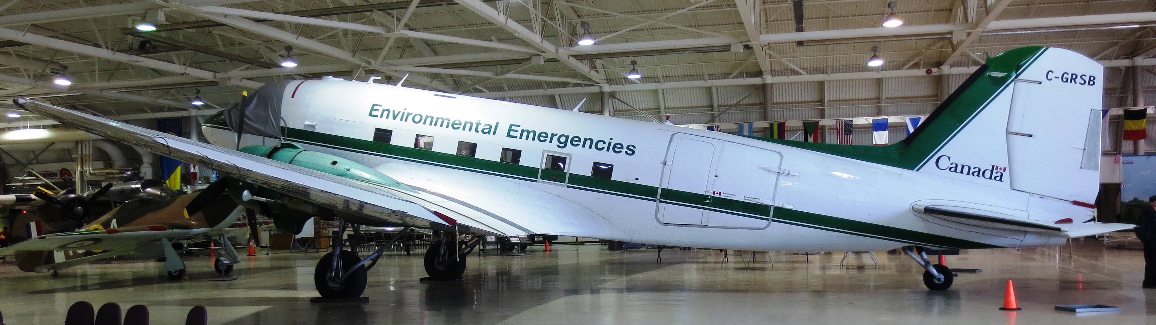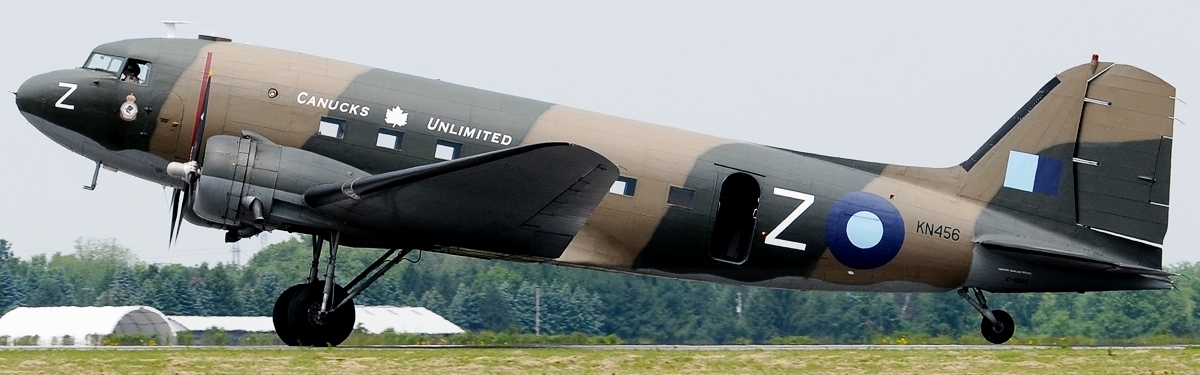 Douglas CC-129 Dakota Mk. III (Serial No. KN456), “Canucks Unlimited“, Reg. No. C-GRSB.  This aircraft flew with the RAF over Normandy on D-Day as RAF (Serial No. FZ692), and later as RCAF (Serial No. 12945).  Airworthy.  (CWHM)