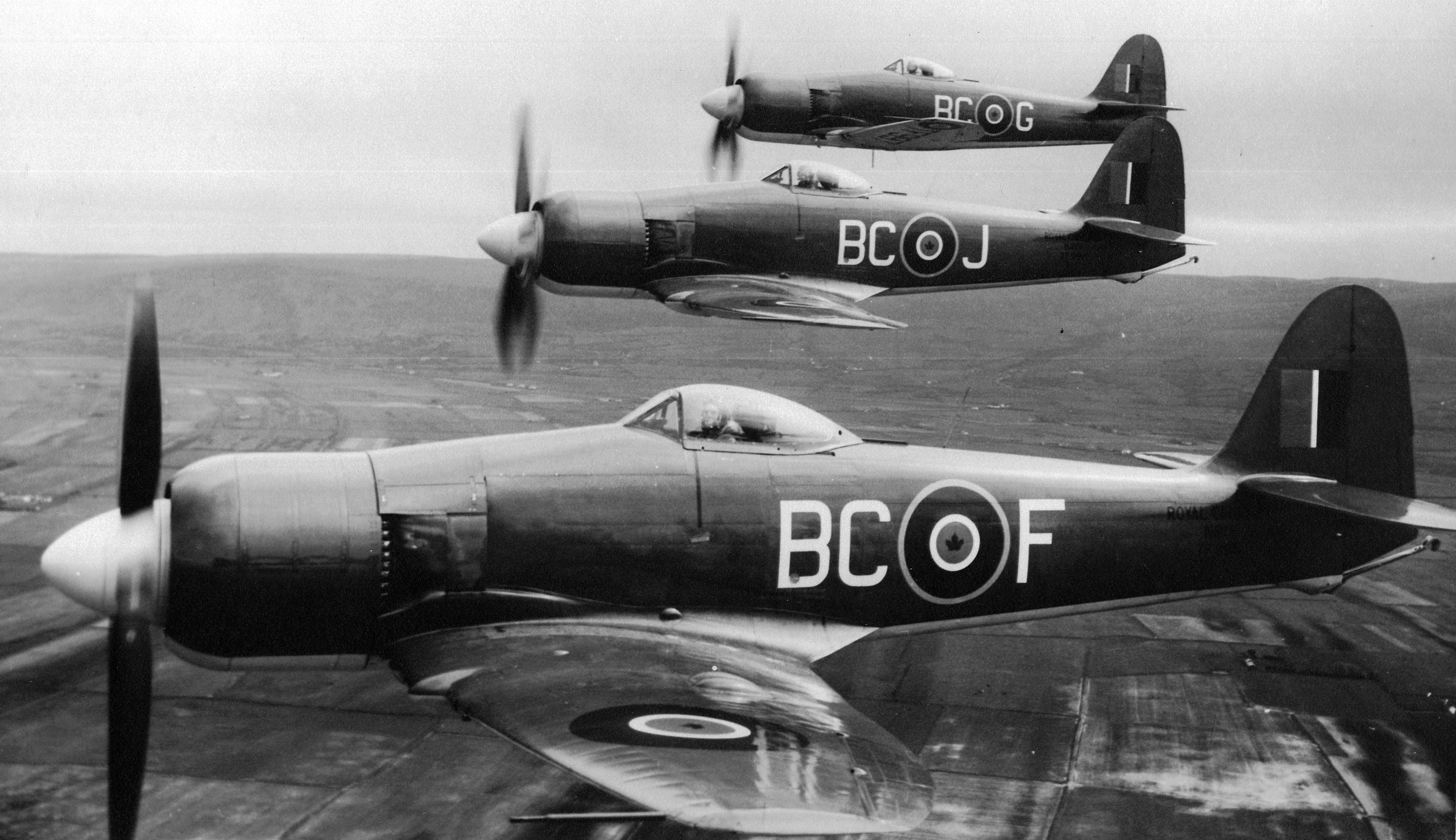 Hawker Sea Fury F.B.10, Royal Canadian Navy, three ship formation, ca 1949.