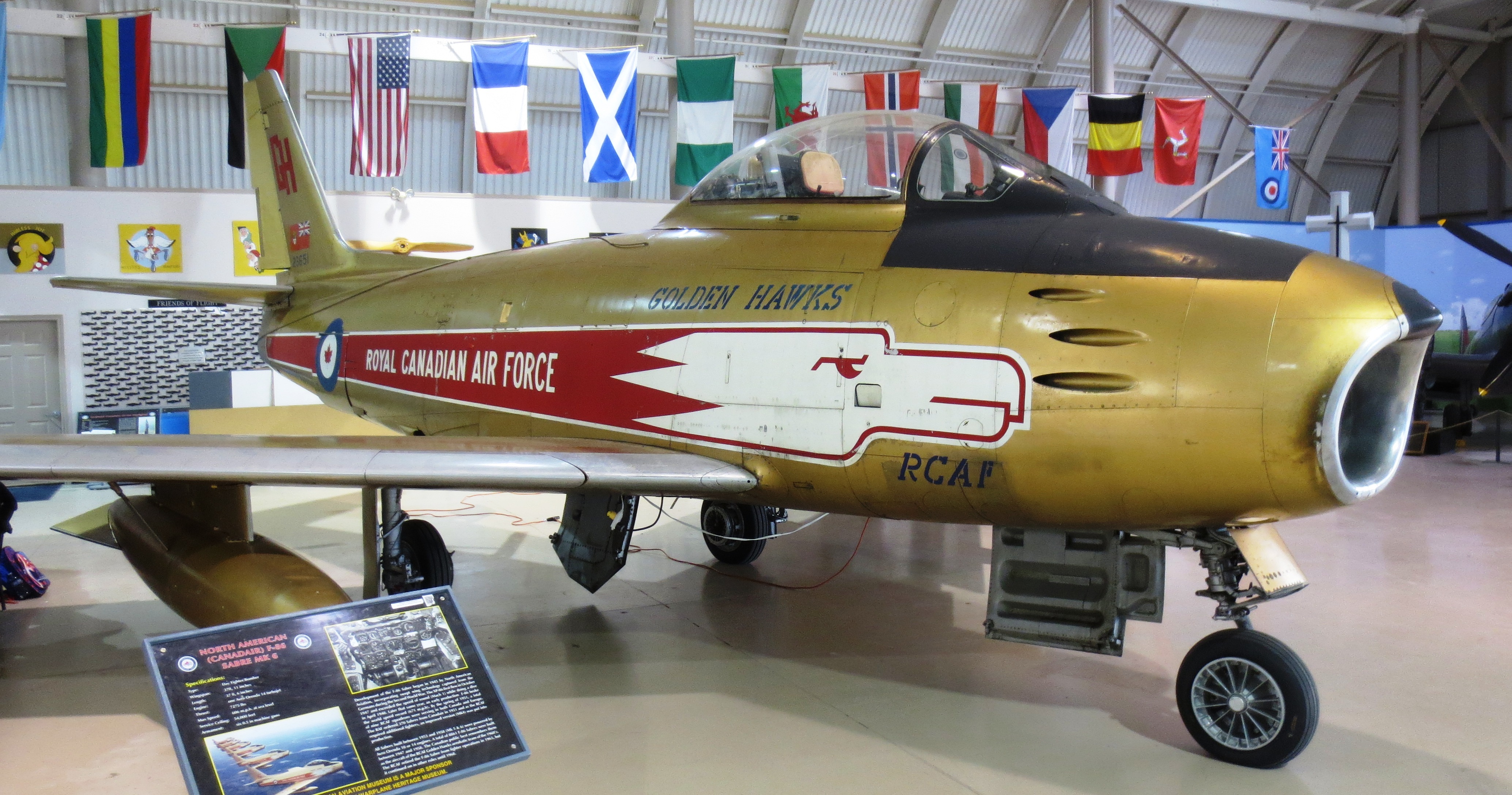 Canadair F-86 Sabre Mk. 6, RCAF (Serial No. 23651), c/n 1441, Golden Hawks.  The CWHM’s Sabre is one of 1,815 built in Canada.  Built in 1956, it flew with the RCAF in Europe for six years and then with the “Golden Hawks” for the 1963 airshow season.  The National Museum of Science and Technology in Ottawa acquired it in 1964.  It has been modified with clear panels down the left side of the fuselage to show its interior construction.  The Sabre is on extended loan from the Canada Aviation and Space Museum in Ottawa.  (CWHM)