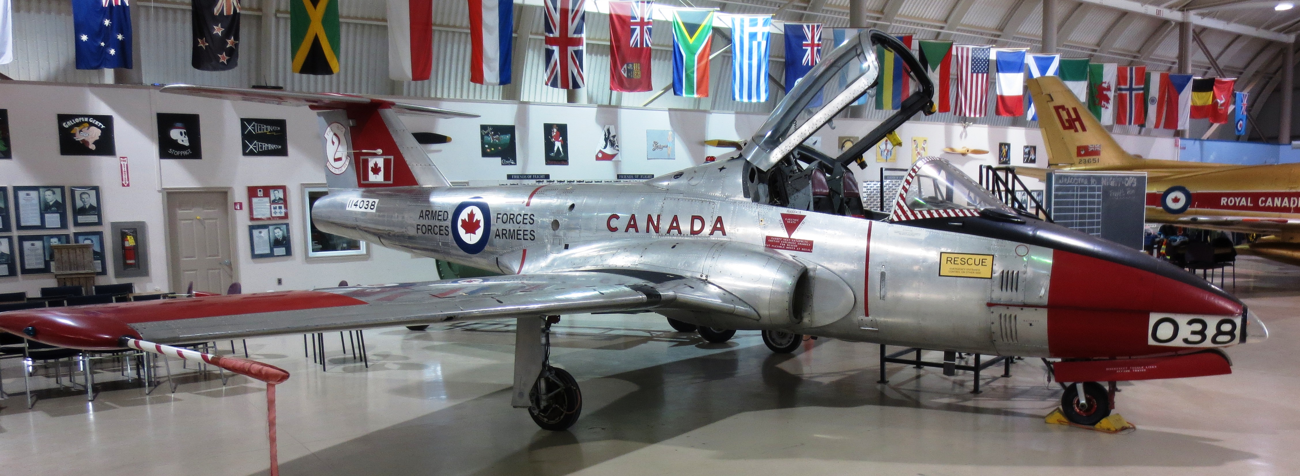 Canadair CT-114 Tutor, RCAF (Serial No. 26038), c/n 1038, painted as (Serial No. 114038).  This aircraft entered service with the Canadian Armed Forces in 1965.  It spent most of its career at CFB Moose Jaw, Saskatchewan, attached to No. 2 Flying Training School and was retired along with the rest of the fleet in 2000.  The Museum acquired this aircraft from the Department of National Defence in September 2005.  (CWHM)