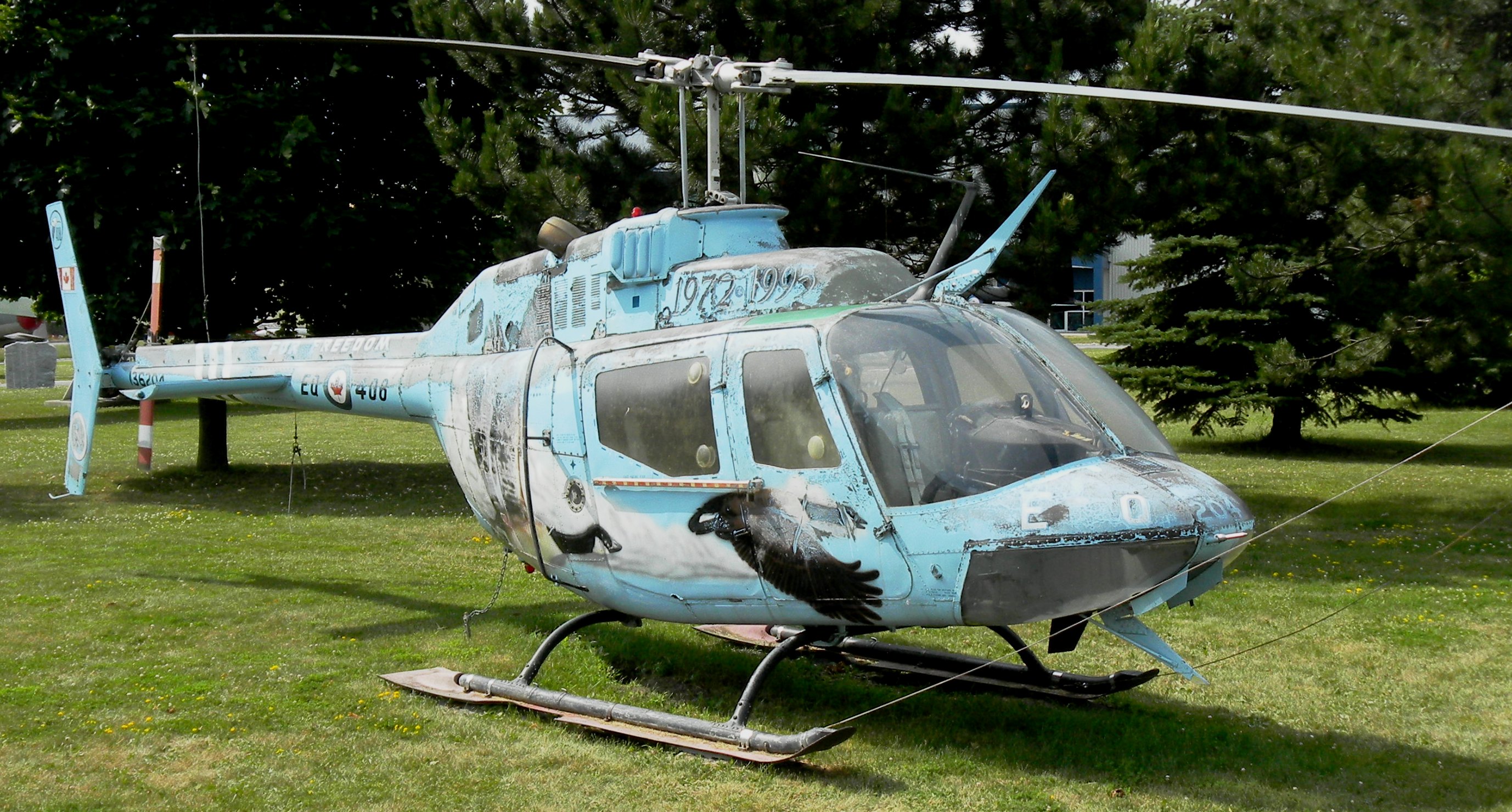Bell CH-136 Kiowa Helicopter (Serial No. 136204). The museum’s example served No. 408 ‘Goose’ Squadron in Edmonton, where its primary goal was to provide tactical air support for the army. Upon its retirement in 1996, the aircraft was given its current paint scheme to honour both the Kiowa and 408 Squadron’s contribution to the Canadian Forces. The image of the flying geese represents 408’s mascot, while the ‘For Freedom’ phrase is the squadron’s motto. The black-and-white markings on the tail are the same markings used by Allied Invasion aircraft during the Second World War, in which 408 Squadron was involved. The ‘EQ’ represents the unit’s Second World War tail code. (NAFMC)