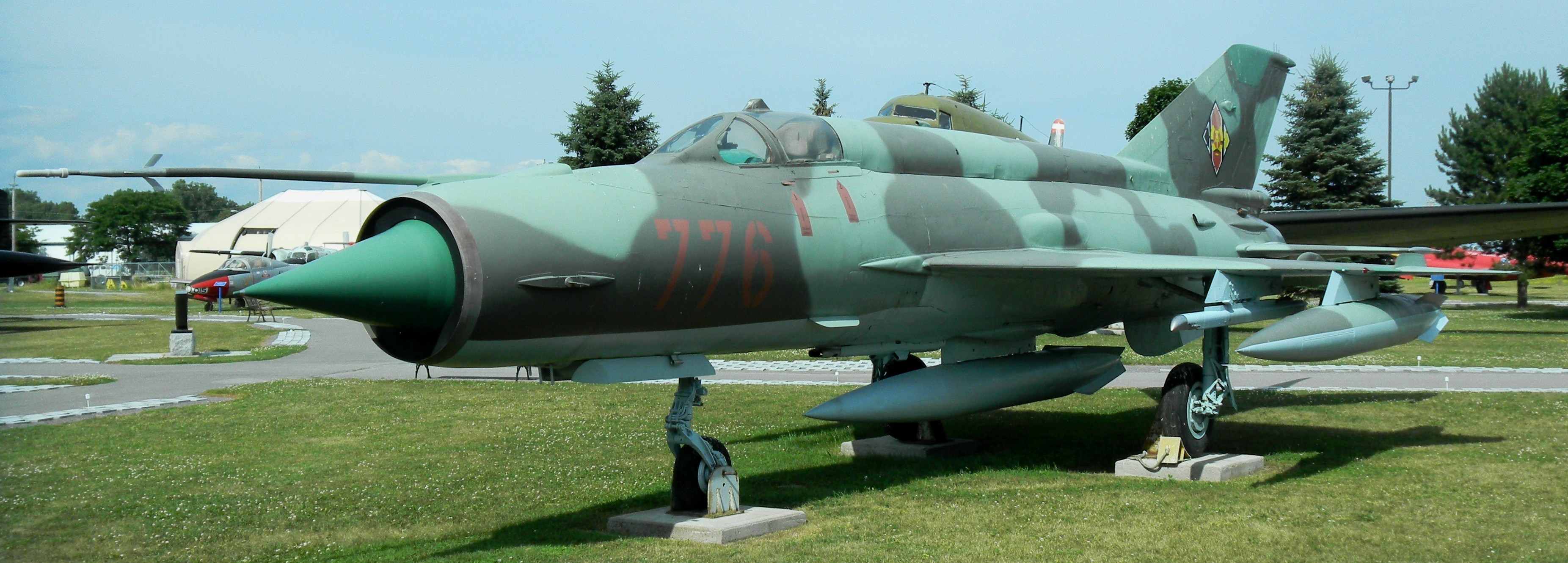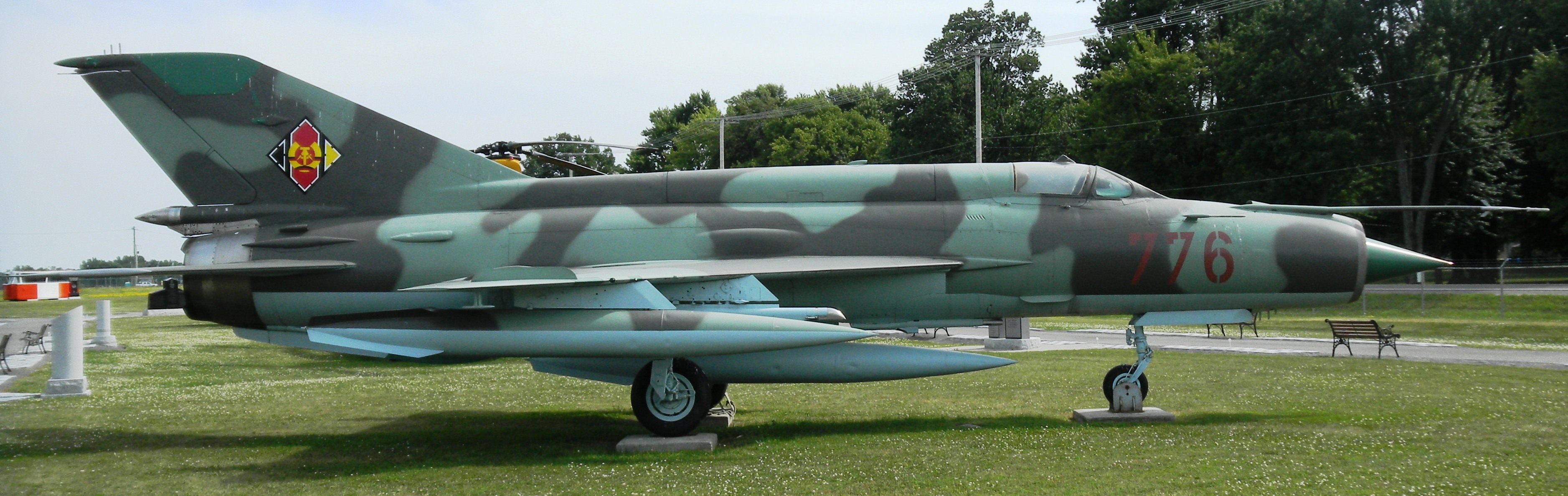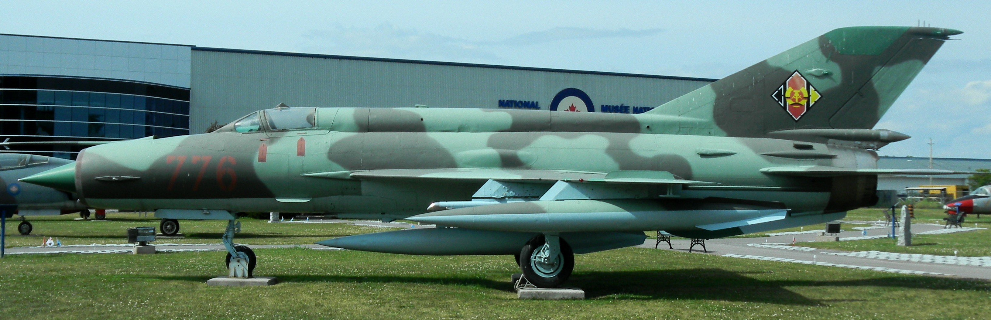 Mikoyan-Gurevich MiG-21MF Fishbed-J (Serial No. 2345), No. 776. The MiG-21 is a Russian-designed aircraft that was never flown by the Canadian military. It was used primarily by countries in the Eastern Bloc, Middle East and Asia during the Cold War. NATO assigned the codename ‘Fishbed’ to the fighter. There were over 10 000 MiG models built and many are still in service today. This particular example was based in East Germany and was in service from 1975-1990. It was donated to the museum in 1993 by the Government of Germany. (NAFMC)
