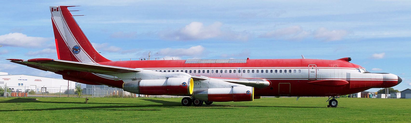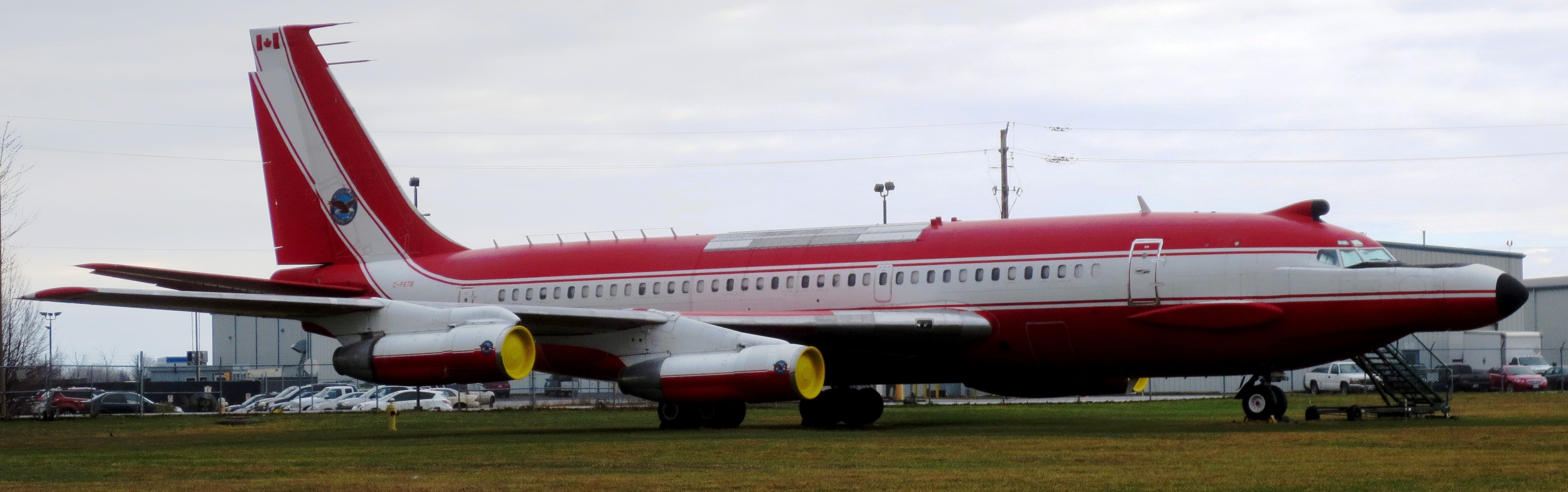 Boeing 707 aerial research aircraft with modified nose. Introduced by Boeing in 1959, the 720 was a smaller capacity, lighter, medium range variant of the 707, one of the most successful airliners of the 20thcentury. C-FETB was a 720 flying test bed operated by Pratt & Whitney Canada until 2010. The Model 720-023B (construction number 18024) was the 177th Model 707-type airplane made by Boeing Airplane. R olled out on 28 Oct 1960, the airplane, Reg. No. N7538A, flew on 14 Jan 1961. It was delivered to American Airlines on 3 Feb. This airline operated N7538A until August 1971, when it was put in storage in Tulsa, Oklahoma. Middle East Airlines (MEA), the largest airline in Lebanon, bought the airplane on 25 Sep 1971. Re-registered as OD-AFQ, the airplane was delivered to its new owner on 30 Sep. Like many, if not most MEA airplanes, OD-AFQ was forced to stay away from its main base in Beirut when Israel invaded Lebanon, in June 1982, occupying a good part of the country until 1985. Based at Orly, an airport near Paris, the airplane occasionally flew passengers for Air France and Air Inter, another French airline. Pratt & Whitney Canada (PWC) bought the Model 720B in December 1985 and re-registered it as C-FETB (Flying Experimental Test Bed) on 10 Jan 1986. A series of modification were made after this date. C-FETB did its flight acceptance flight on 9 Oct 1986. A PWC crew flew the airplane across the Atlantic on 12 Oct. Known internally as FTB1 (Flying test bed 1), C-FETB was thoroughly modified for its new role between October 1986 and January 1988. It was equipped to test a variety of engines. (NAFMC).