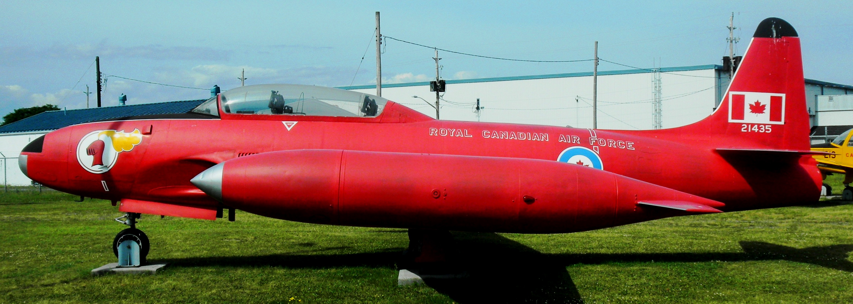 Canadair CT-133 Silver Star (Serial No. 133435), (Serial No. 21435). This Silver Star is painted to represent the colours of the ‘Red Knight,’ a solo aerobatic pilot who performed from 1959-1968. The museum’s aircraft was not a Red Knight, but served with VU 33 Squadron on Vancouver Island, British Columbia. The last Canadian T-33 flew on 31 Mar 2005 in Cold Lake, Alberta. (NAFMC)