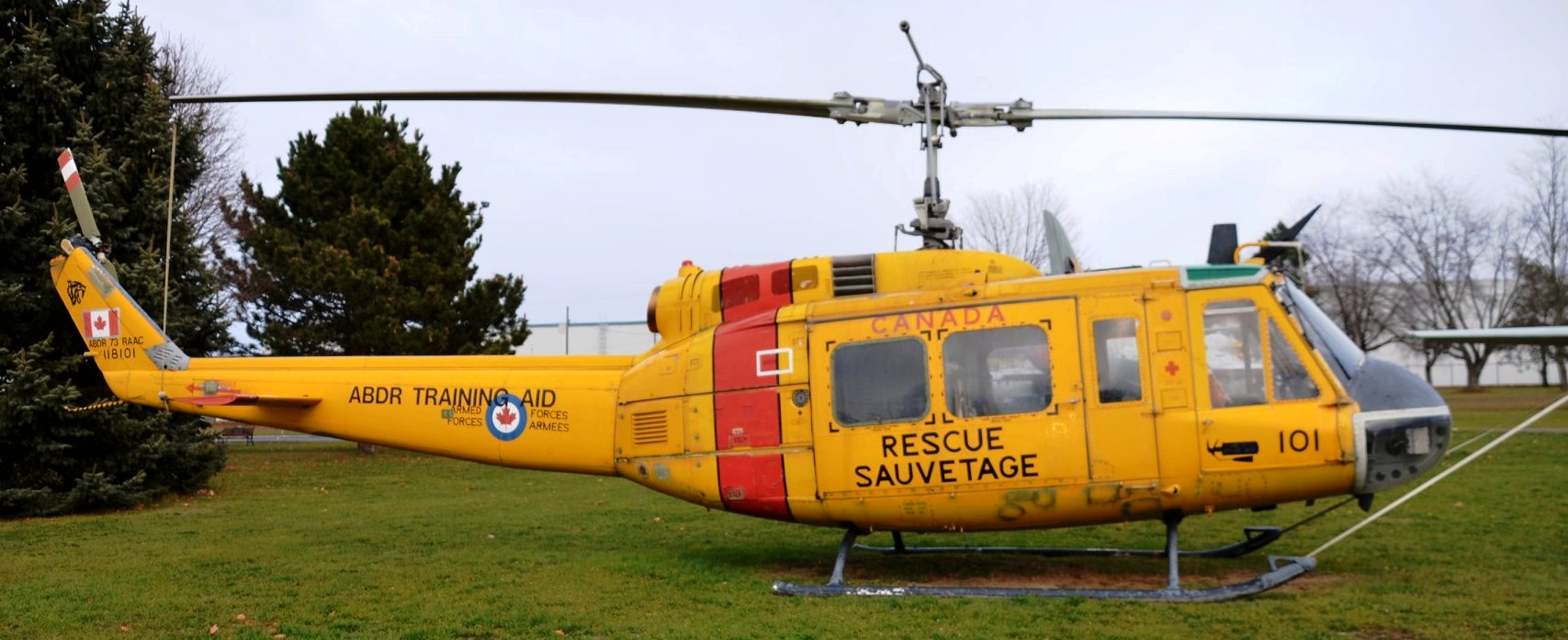Bell CH-118 Iroquois Helicopter (Serial No. 118101). The museum’s Iroquois served part of its service life with No. 439 ‘Tiger’ Squadron, which was activated in Bagotville in 1993 as a Combat Support unit. All Iroquois were replaced by Bell Griffon helicopters in 1995. The museum’s helicopter was used for Aircraft Battle Damage Repair training at CFB Borden and then at CFB Trenton. (NAFMC)
