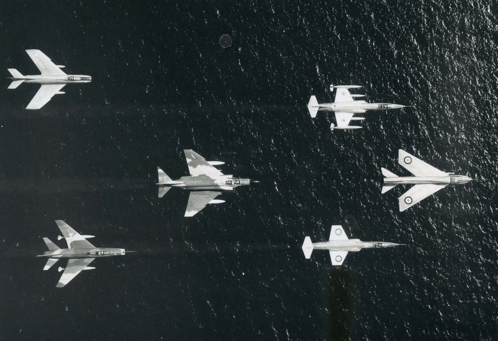 CF-104 vertical shot of a NATO formation with a French Super-Mystere B2, a Belgian F-104 Starfighter, US F-4 Phantom II, British Electric Lightning, US North American F-100 Super Sabre, and a Canadian CF-104 Starfighter, c1960s.