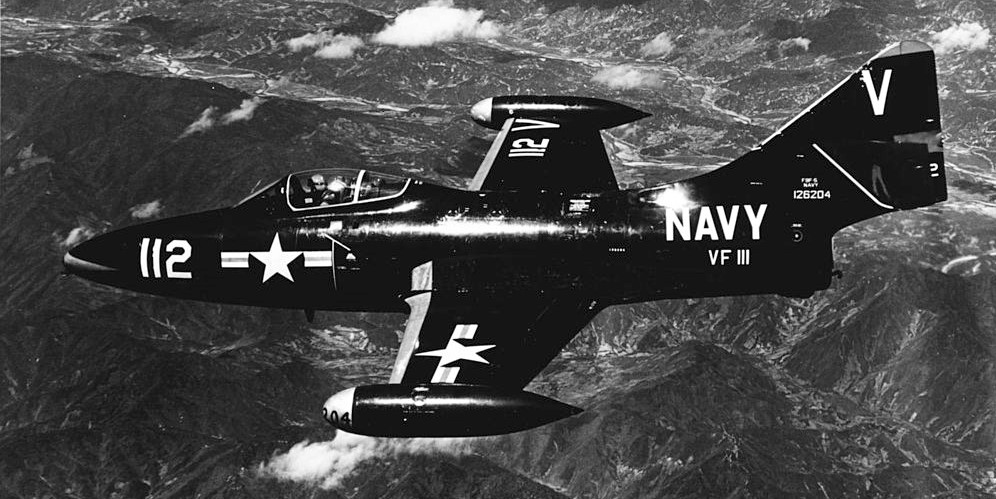U.S. Navy Grumman F9F-5 Panther jet fighter (BuNo 126204) from Fighter Squadron 111 (VF-111) “Sundowners” in flight over mountainous Korean terrain, 14 June 1953.