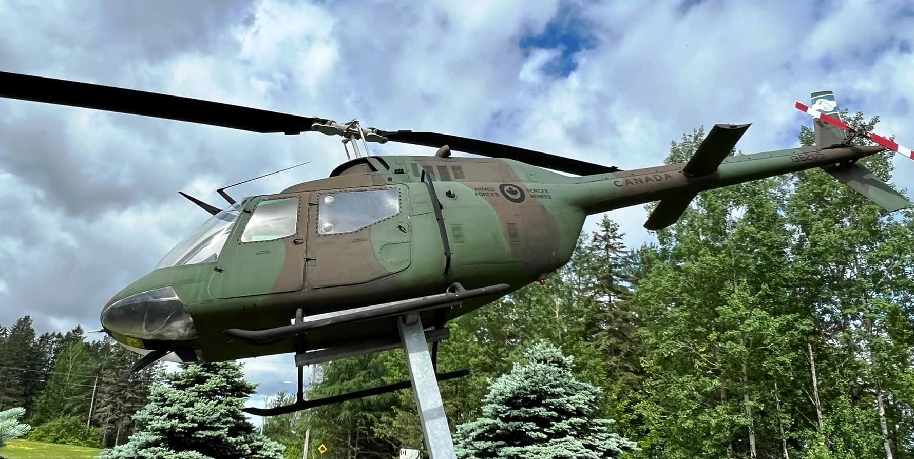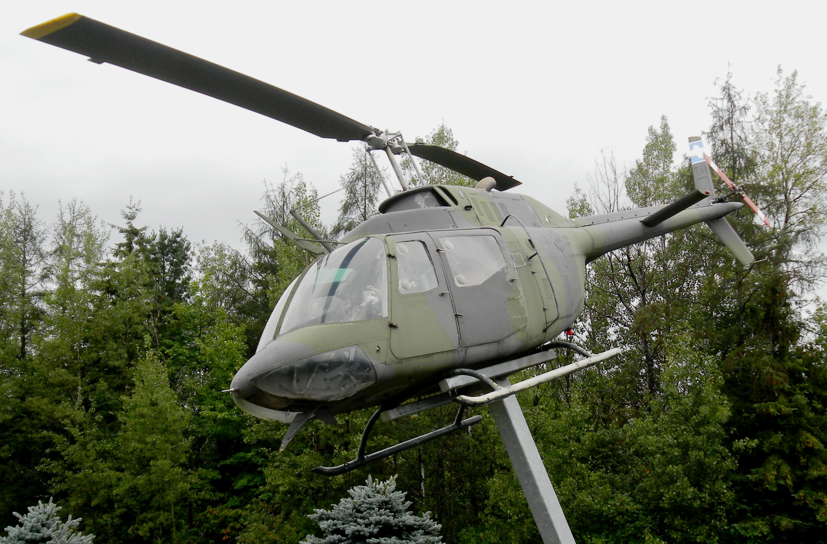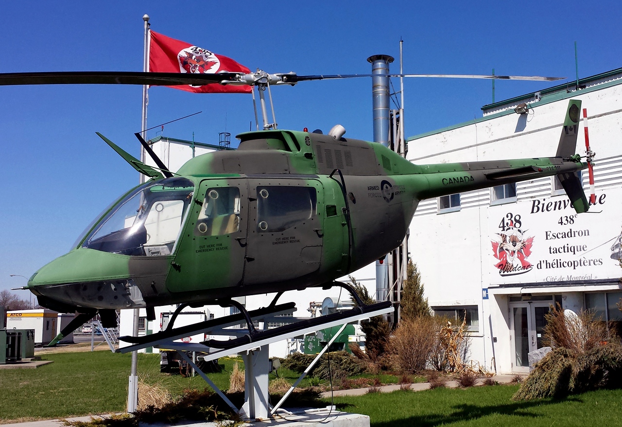 Bell CH-136 Kiowa Helicopter (Serial No. 136211), No. 438 Squadron, mounted on a pylon. St Hubert, CFB Montreal, Québec. No. 438 Squadron flew the CH-136 from 1982 to 1995.