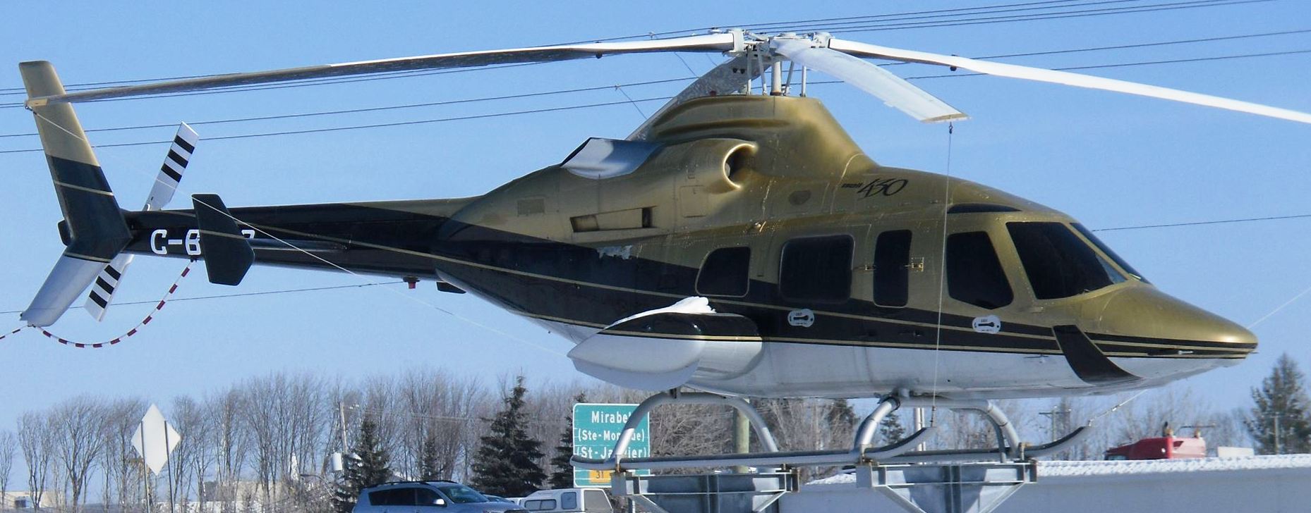 Bell Model 430 Helicopter, C-BCHD, C-B86, mounted on an iron tripod base, 12800 Rue de l’Avenir.