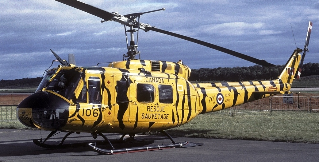 Bell CH-118 Iroquois Helicopter. (Serial No. 118106), seen here in a Tiger striped scheme on a cold and cloudy day, 10 Sep 1994. These colours were used to celebrate the 70th anniversary of the RCAF by 439 Squadron. This aircraft is now an instructional airframe used for Aircraft Battle Damage Repair (ABDR) training at CFB Borden, Ontario.