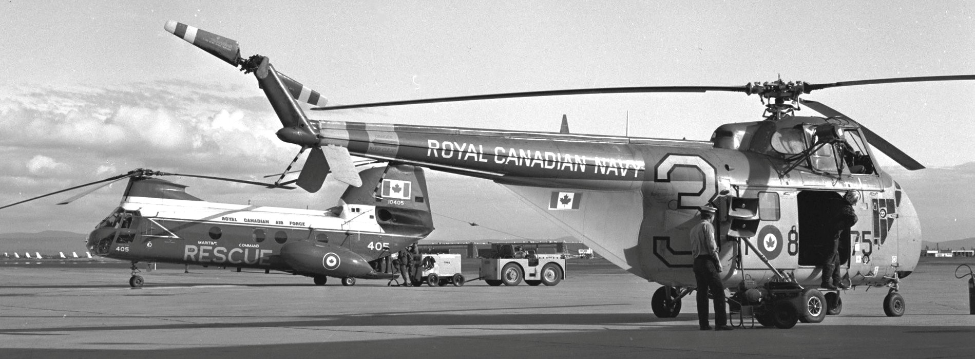 Boeing Vertol CH-113 Labrador (Serial No. 10405), and Sikorsky HO4S-3, RCN (Serial No. 55875), coded 3, sometime after 1965 when the new flag came into use.