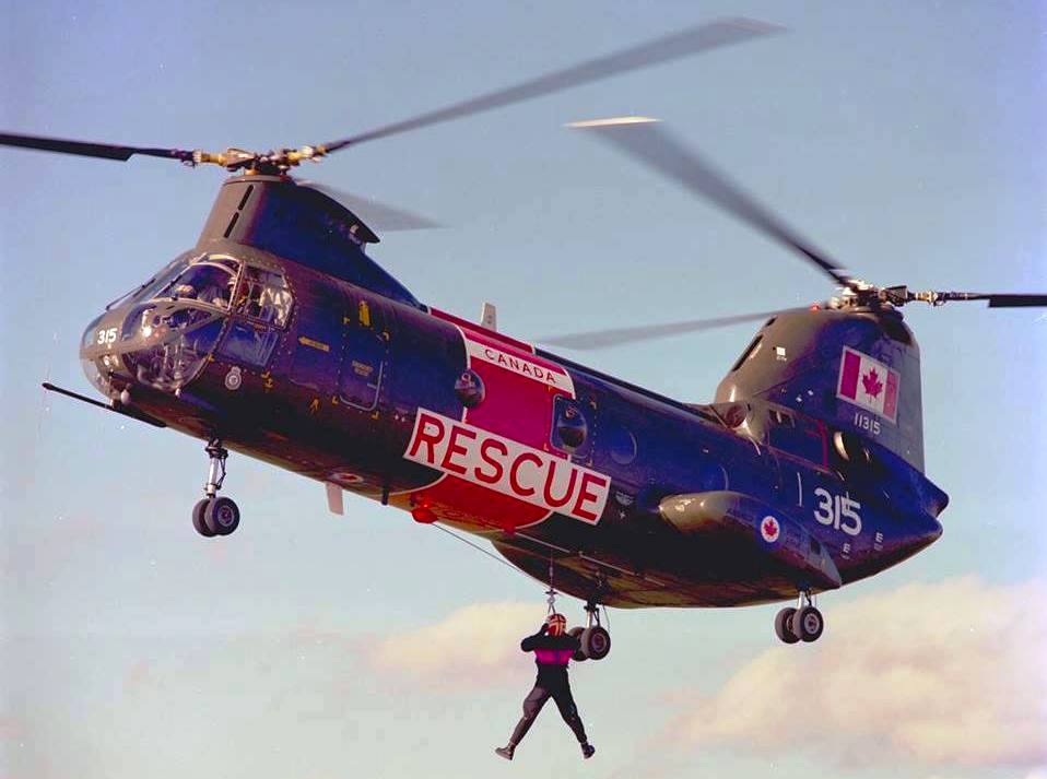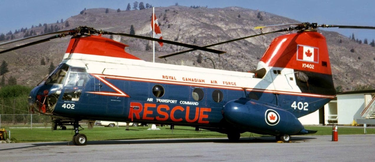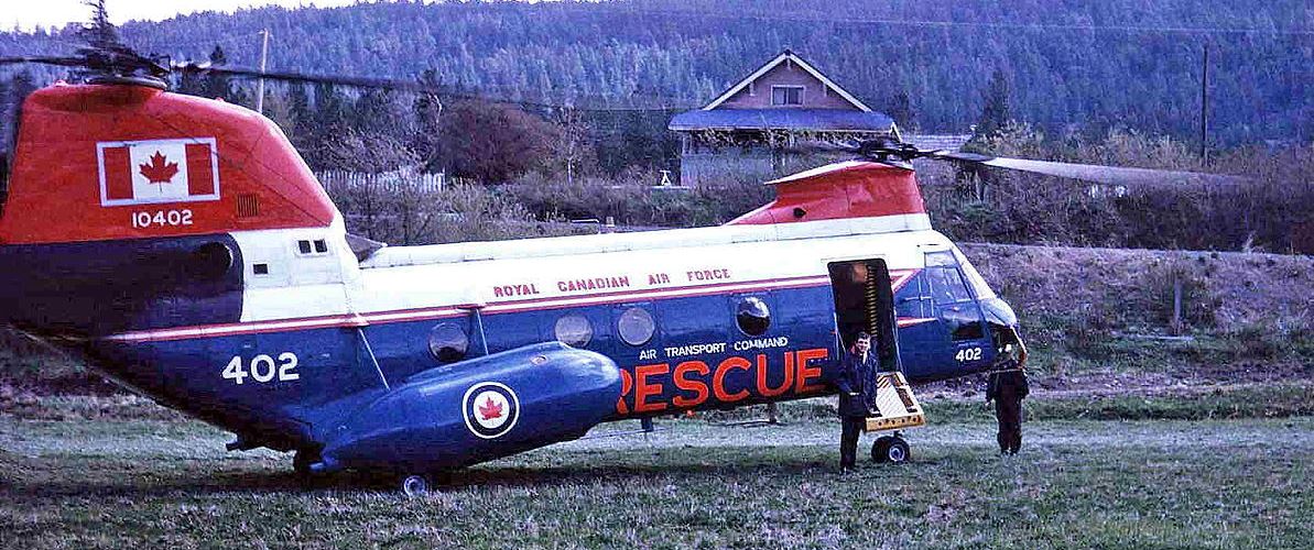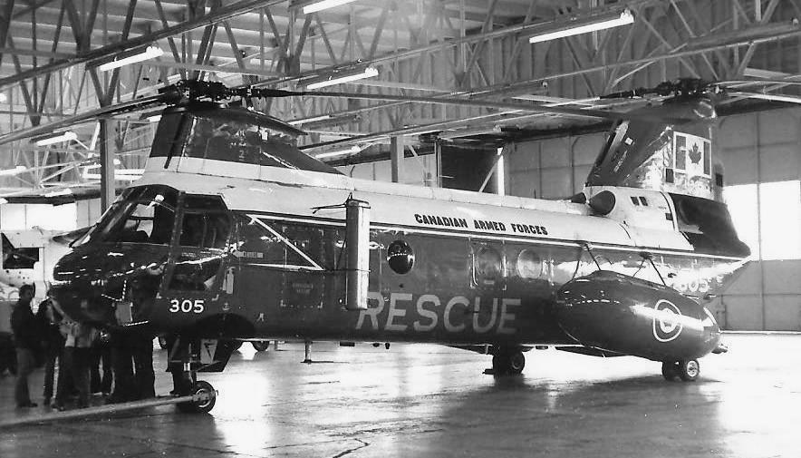 Boeing Vertol CH-113 Labrador helicopter, RCAF (Serial No. 10403), later (Serial No. 11303), with RCAF Crash Boat Flamingo and CCG Cutter Spray, training on the Bay of Quinte, Ontario, ca 1962-63.  Served with No. 413 Transport and Rescue Squadron at 14 Wing, Greenwood, NS, dates unknown.  With 442 Squadron, CFB Comox, in 1975, 1979 and 1982.  Performed multiple rescues, involving 12 boaters and hikers, following storm on 30 March 1975 while with this unit.  MCpl W. Wacey received Star of Courage for this day, which included 9.5 hours flying.  With 103 Rescue Unit, CFB Gander in 1975 in red, white and blue scheme.  Back with No. 442 Squadron when it took part in mass rescue from burning cruise ship MV Prinsendam off Alaska coast on 4 October 1980.  With No. 103 RU in 1983 and 1995 in overall yellow scheme.  With No. 424 Squadron at CFB Trenton, dates not known.  (RWR Walker)