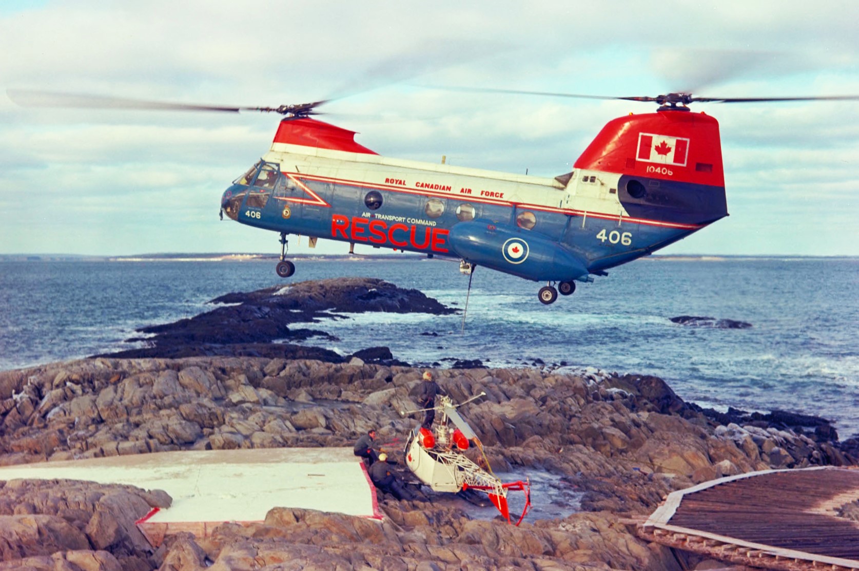 Boeing CH-113 Labrador helicopter (Serial No. 10406) No. 103 (RU) Squadron, flying over Cull Rock, Nova Scotia.  It is picking up aDOT Bell helicopter in 1968. Note the personnel on the ground and on the DOT Bell. 103 Rescue Unit transferred from CFB Greenwood to CFB Summerside during the month of July, 1968. It was re-designated as 413 Rescue Squadron. The unit was re-designated as 413 (Transport and Rescue) Squadron on 31 August, 1970 while at Summerside (CYSU). Today it is based at 14 Wing, CFB Greenwood with a mix of CH-149’s and CC-130H’s. (Chris Charland)