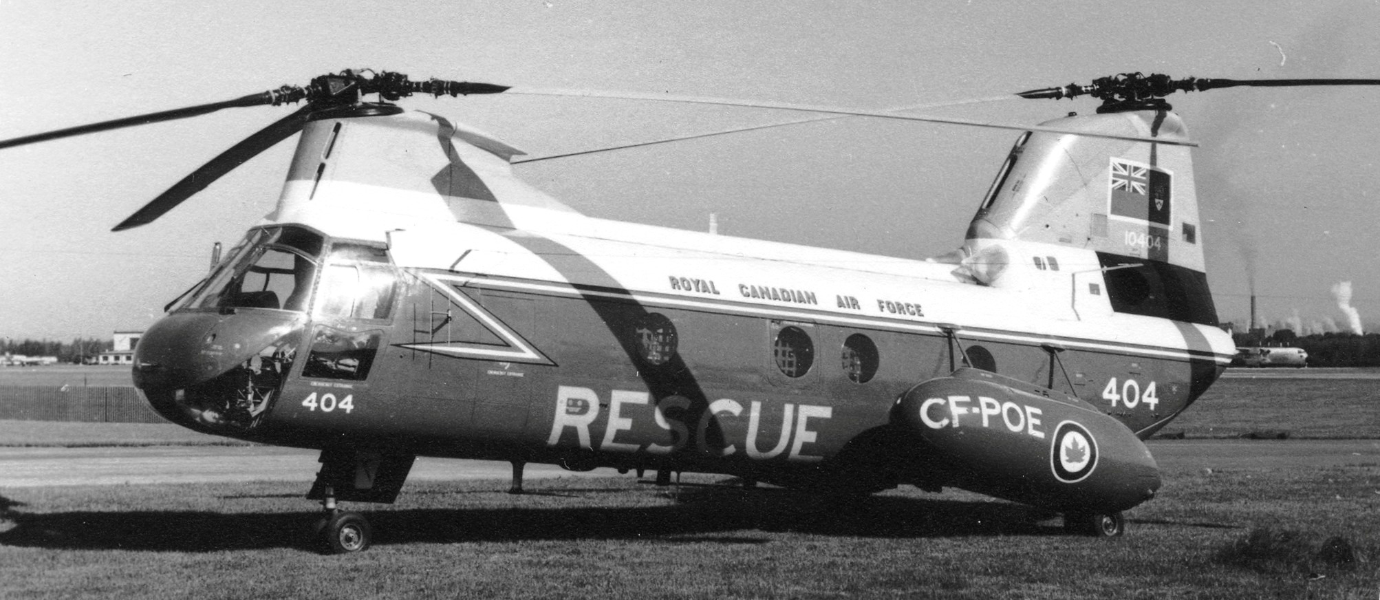 Boeing Vertol CH-113 Labrador Helicopter (Serial No. 10404), c/n 304, wearing its ferry flight registration (CF-POE).  This photo was taken at Rockcliffe, Ontario, on 6 June 1964.  This is a Boeing-Vertol 107 II, known as the CH-46 Sea Knight in the USMC but designated by the RCAF as a Labrador.  The Labradors and Voyageurs all were eventually converted to be almost the same in the SAR role.  This particular Labrador was flight tested by Boeing-Vertol as N10122, then flown to Canada as CF-POE, and given the RCAF registration of 10404.  After unification it was designated a CH-113 with the registration number of 304.  In 2008 this aircraft was sold to Columbia Helicopters in the US possibly for use as a source of spare parts.
