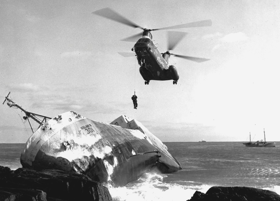 Boeing Vertol CH-113 Labrador helicopter effecting a rescue from a shipwreck, 1963.