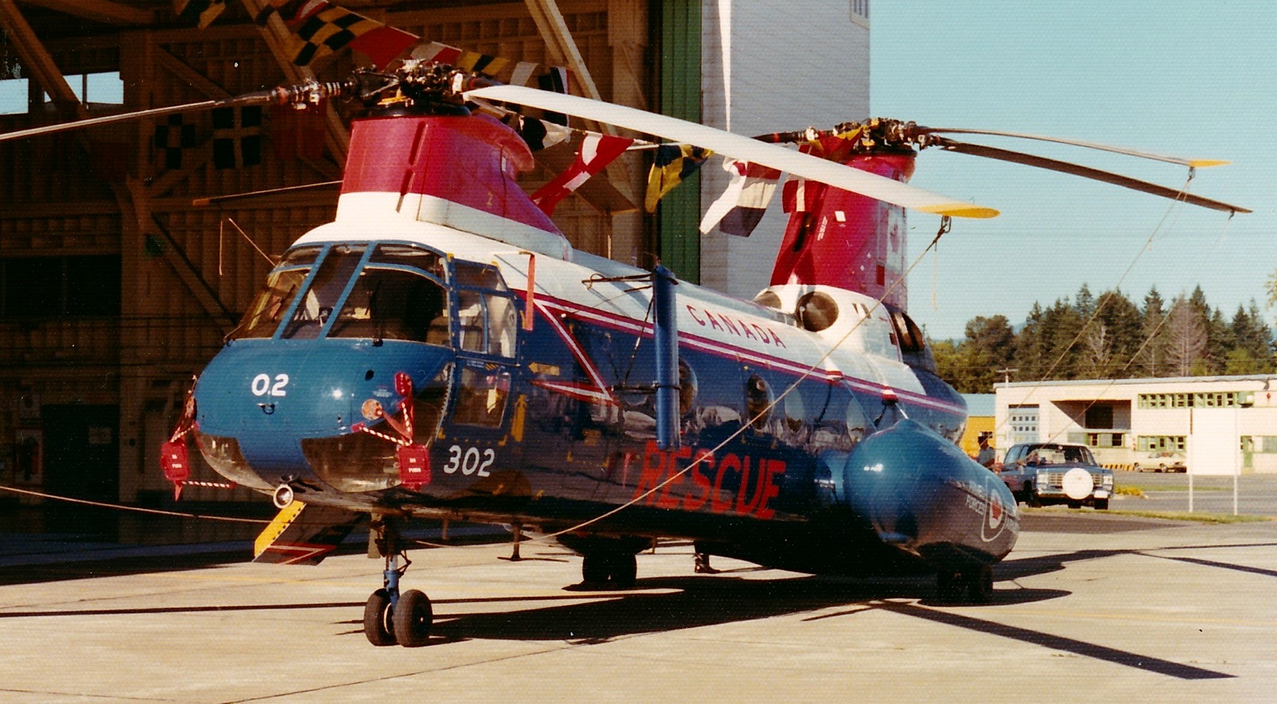 Boeing Vertol CH-113 Labrador (Serial No. 11302),  in front of the old No. 442 Squadron Hangar at CFB Comox, British Columbia.  The MSE section is in the background.