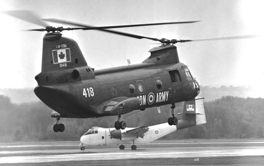 Boeing Vertol CH-113A Voyageur Helicopter (Serial No. 10418), later (Serial No. 11318), Canadian Army with an RCAF de Havilland Caribou, c1970.