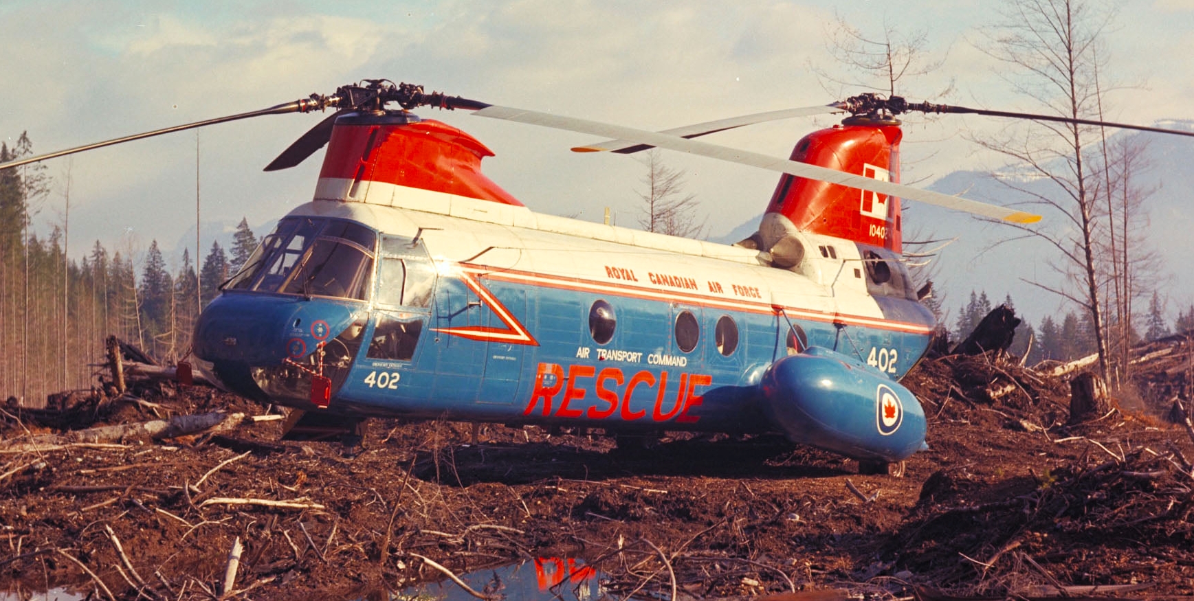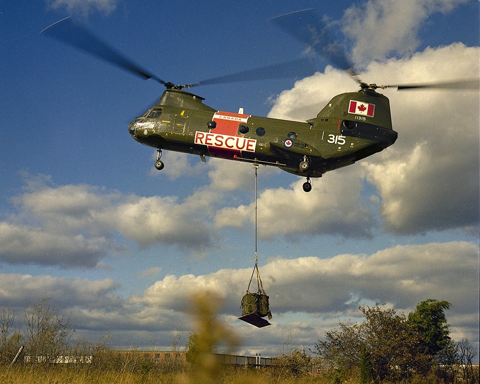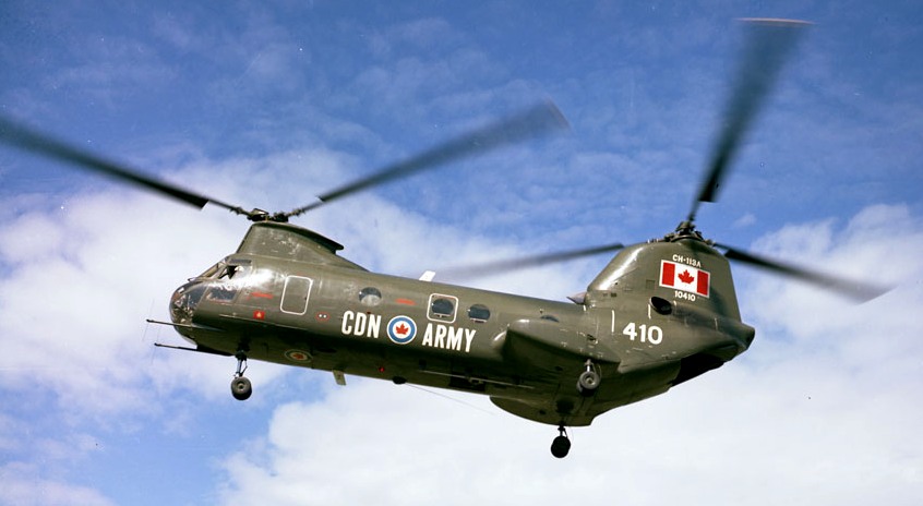 Boeing Vertol CH-113A Voyageur Helicopter (Serial No. 10411), later (Serial No. 11311), Canadian Army, lifting a 3/4-ton truck, ca 1965.  Converted to SAR configuration Labrador 1975.  With 103 Rescue Unit, CFB Gander, Newfoundland, in 1982 and 1983.  Serving with No. 442 Squadron at CFB Comox, BC at time of crash.  Was hoisting stranded hikers when engine failure at high altitude caused crash at 5,000 foot level in mountains near Bella Coola, Vancouver Island.  One fatality.  20 August 1993 – Struck off, after crash on 30 April 1992.  (RWR Walker)
