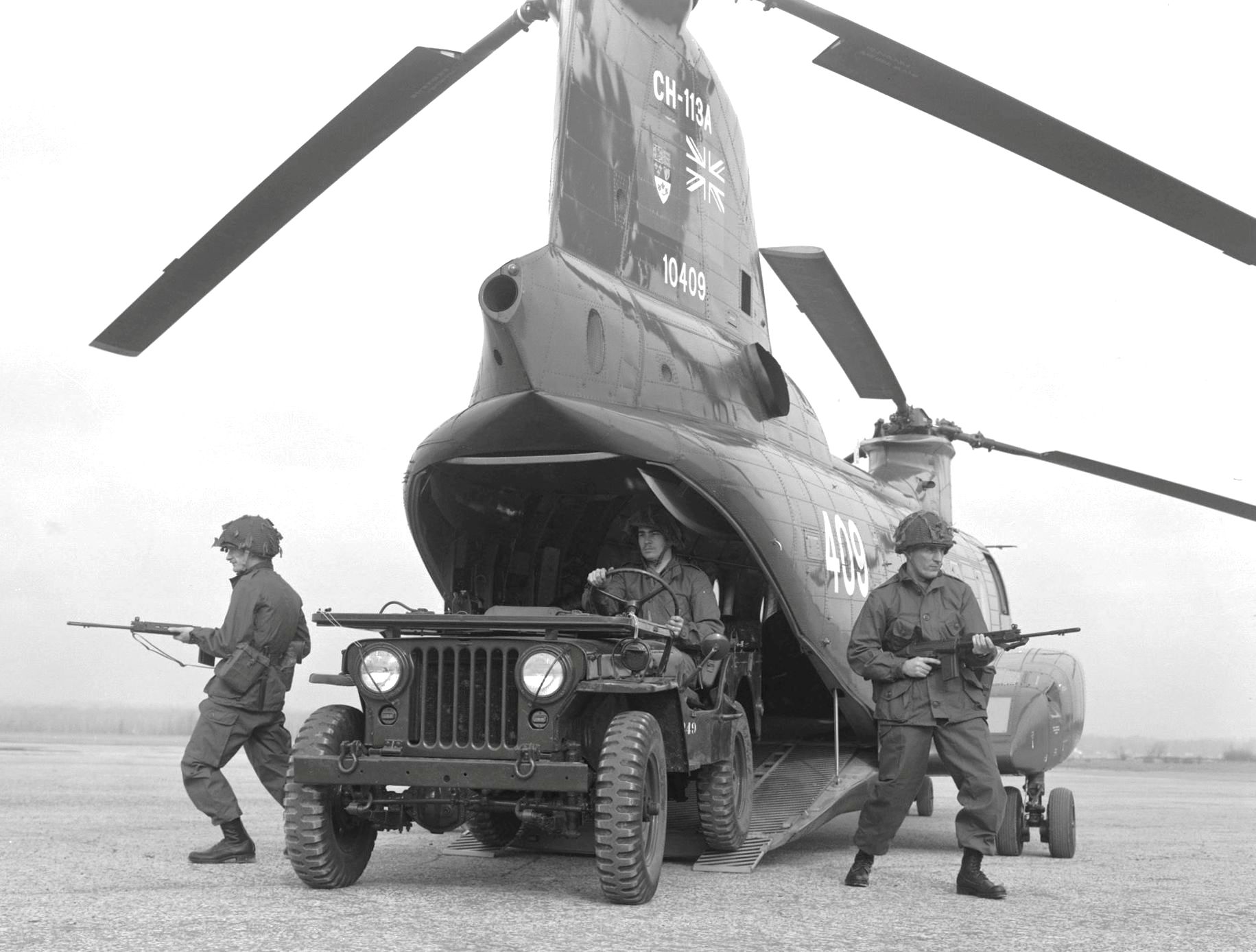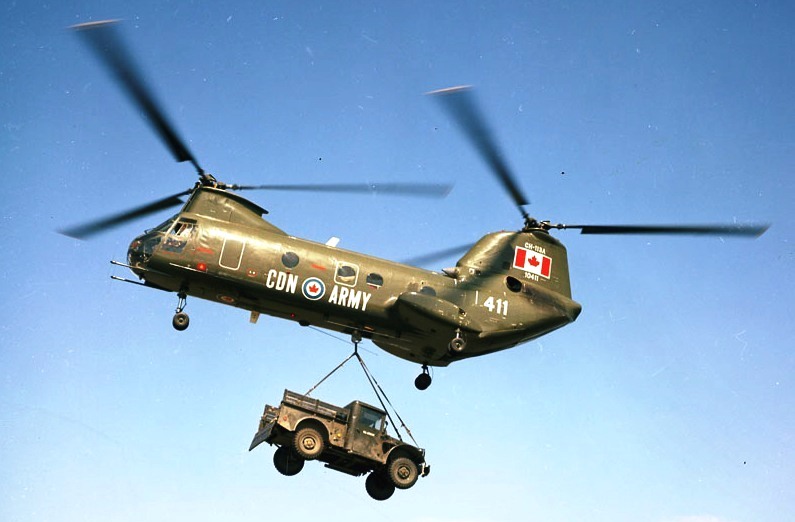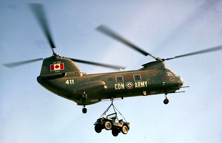 Boeing Vertol CH-113A Voyageur Helicopter (Serial No. 10411), later (Serial No. 11311), Canadian Army, lifting a jeep, ca 1965.
