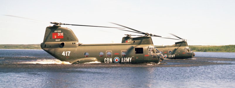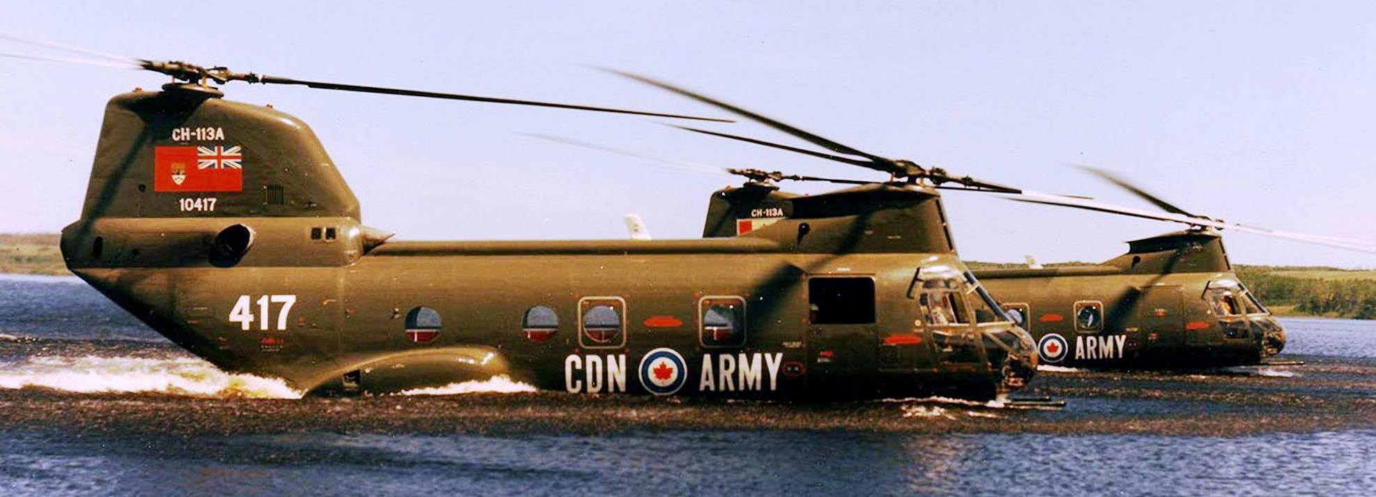 Boeing Vertol CH-113A Voyageur Helicopters (Serial No. 10417), later (Serial No. 11317),  and (Serial No. 10415), later (Serial No. 11315), on the water, ca 1965.