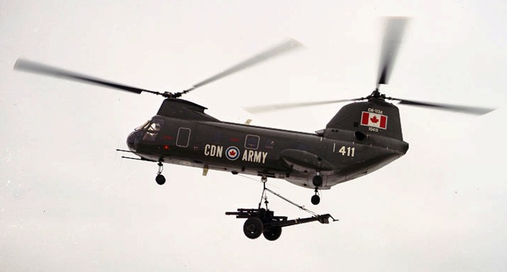 Boeing Vertol CH-113A Voyageur Helicopter (Serial No, 10411), later (Serial No. 11311), Canadian Army, lifting 105-mm C1A1 Field Gun, ca 1965.
