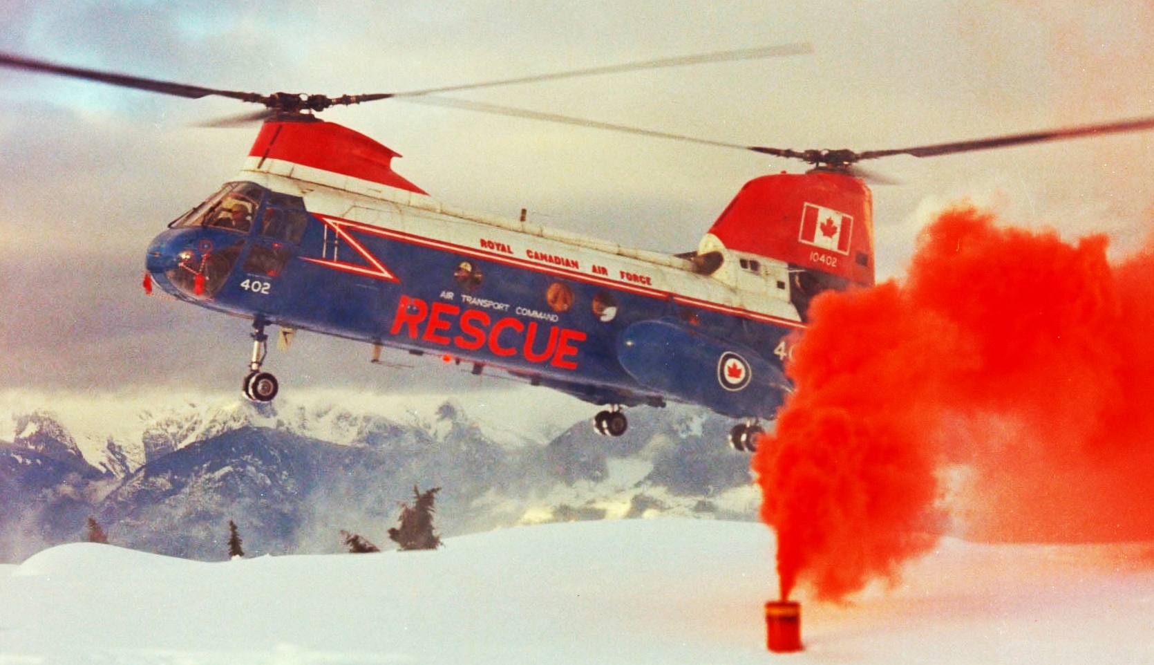 Boeing Vertol CH-113 Labrador helicopter, RCAF (Serial No. 10402), later (Serial No. 11302), using smoke generator for snow landing reference on Mt. Churchill, BC in 1967.