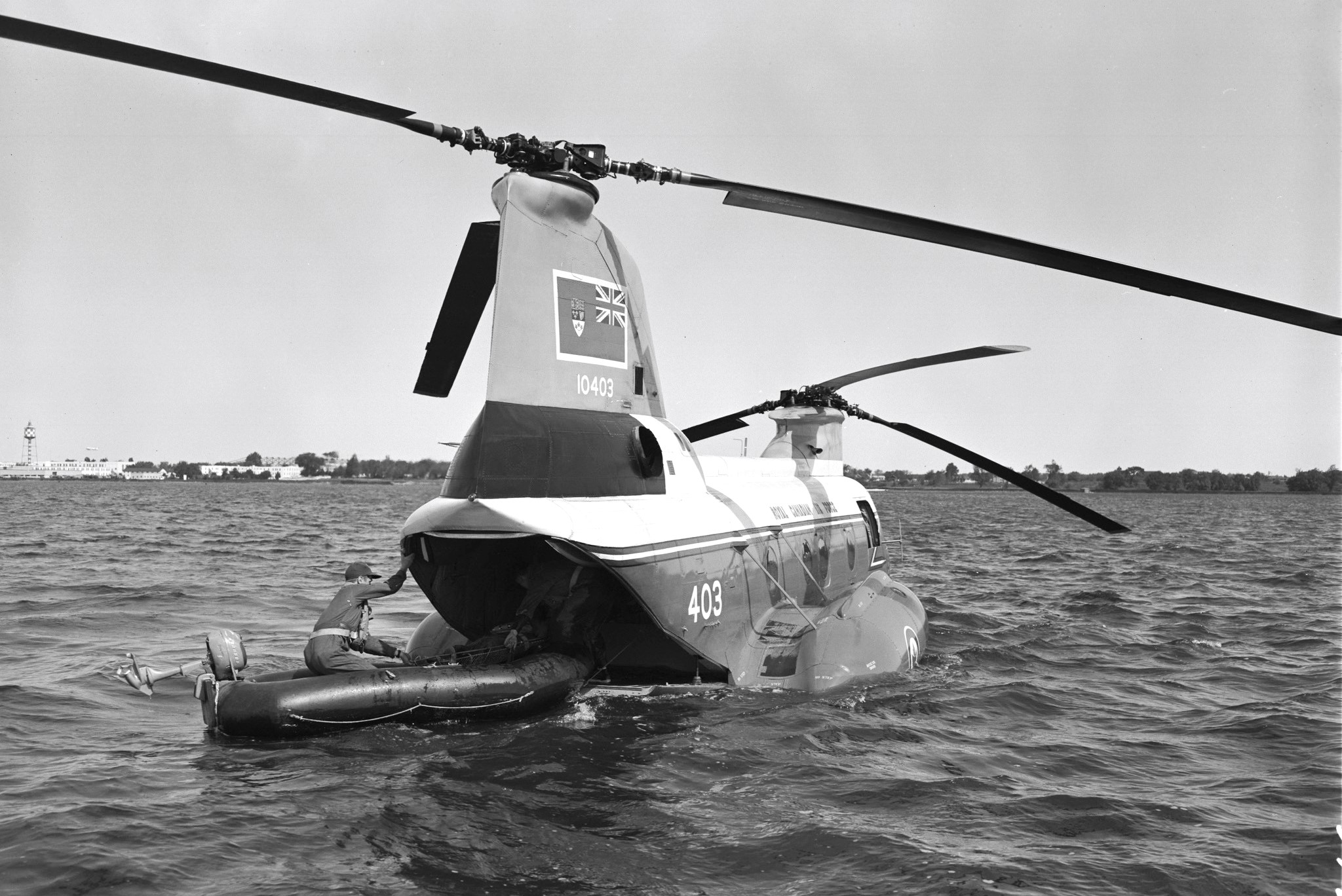 Boeing Vertol CH-113 Labrador helicopter, RCAF (Serial No. 10403), later (Serial No. 11303), floating in the Bay of Quinte near RCAF Station Trenton, ca 1966. A soldier with a rubber dinghy is moored to the rear door of the helicopter.