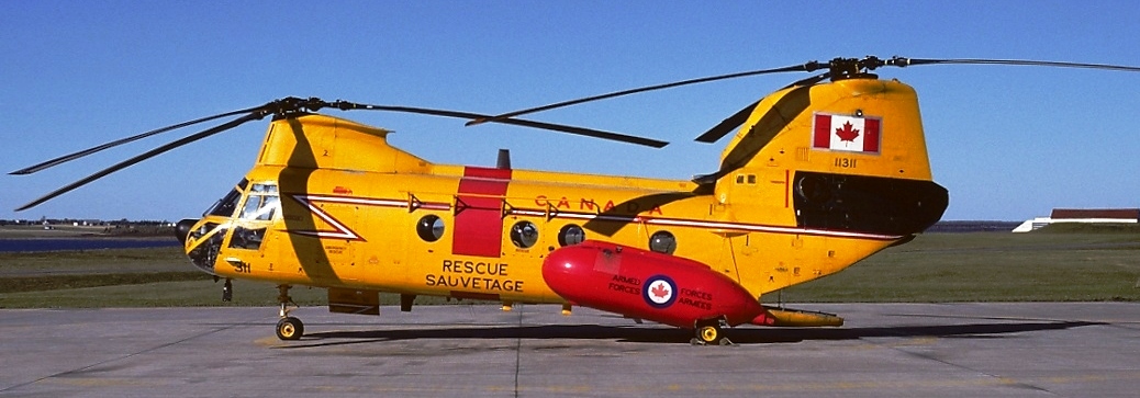 Boeing Vertol CH-113A Voyageur Helicopter (Serial No. 10410), later (Serial No. 11310), Canadian Army, ca 1965.  With No. 413 Squadron, CFB Summerside, PEI, dates unknown.  Converted to SAR configuration Labrador 1975.  With 103 Rescue Unit, CFB Gander, Nfld, in 1982.  Flew 8.1 hours on 15 February 1982, searching for survivors of Ocean Ranger oil rig.  Refueled on other oil rigs during this mission.  With No. 442 Squadron, CFB Comox, BC in 1991 and 1995.  Subsequently operated by No. 424 Squadron, CFB Trenton, Ontario.  Took part in retirement ceremonies and flight display at Trenton, 26 June 2004.  19 July 2004 – Delivered to CFSATE, CFB Borden, Ontario, for use as instructional airframe.  (RWR Walker)