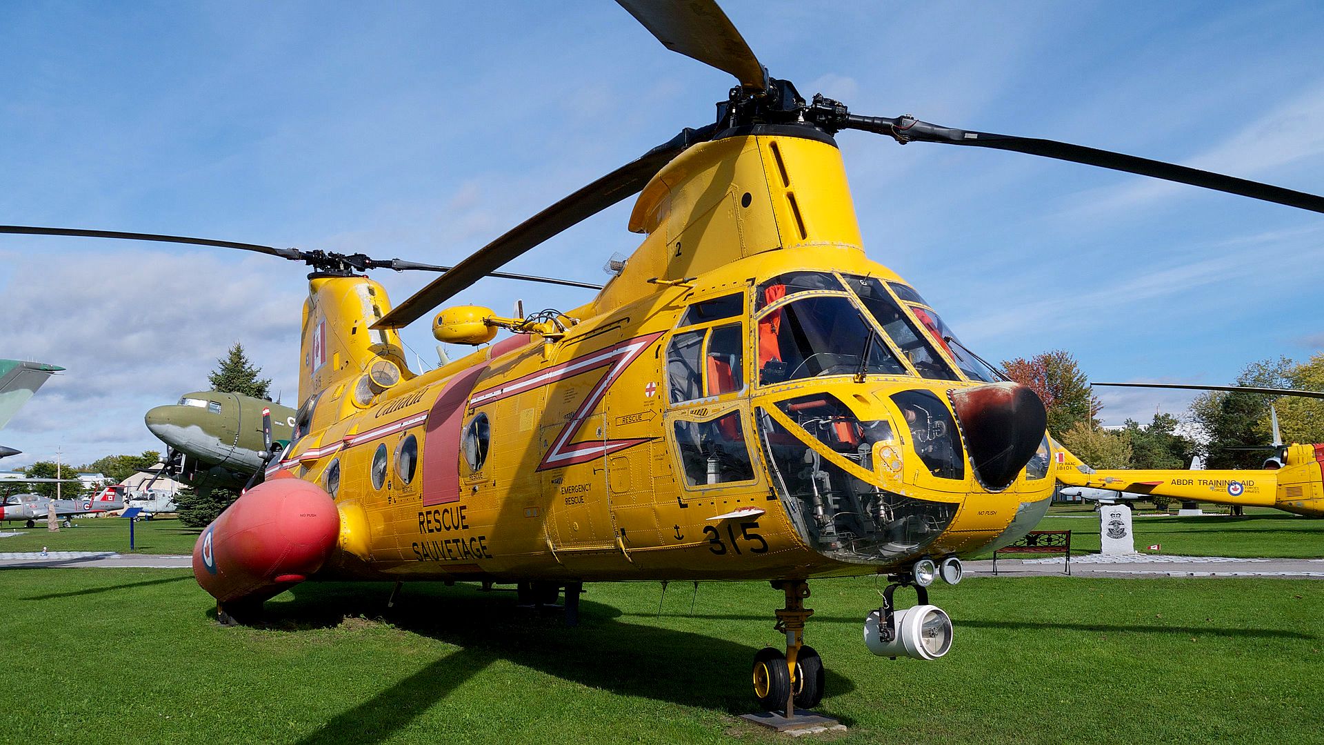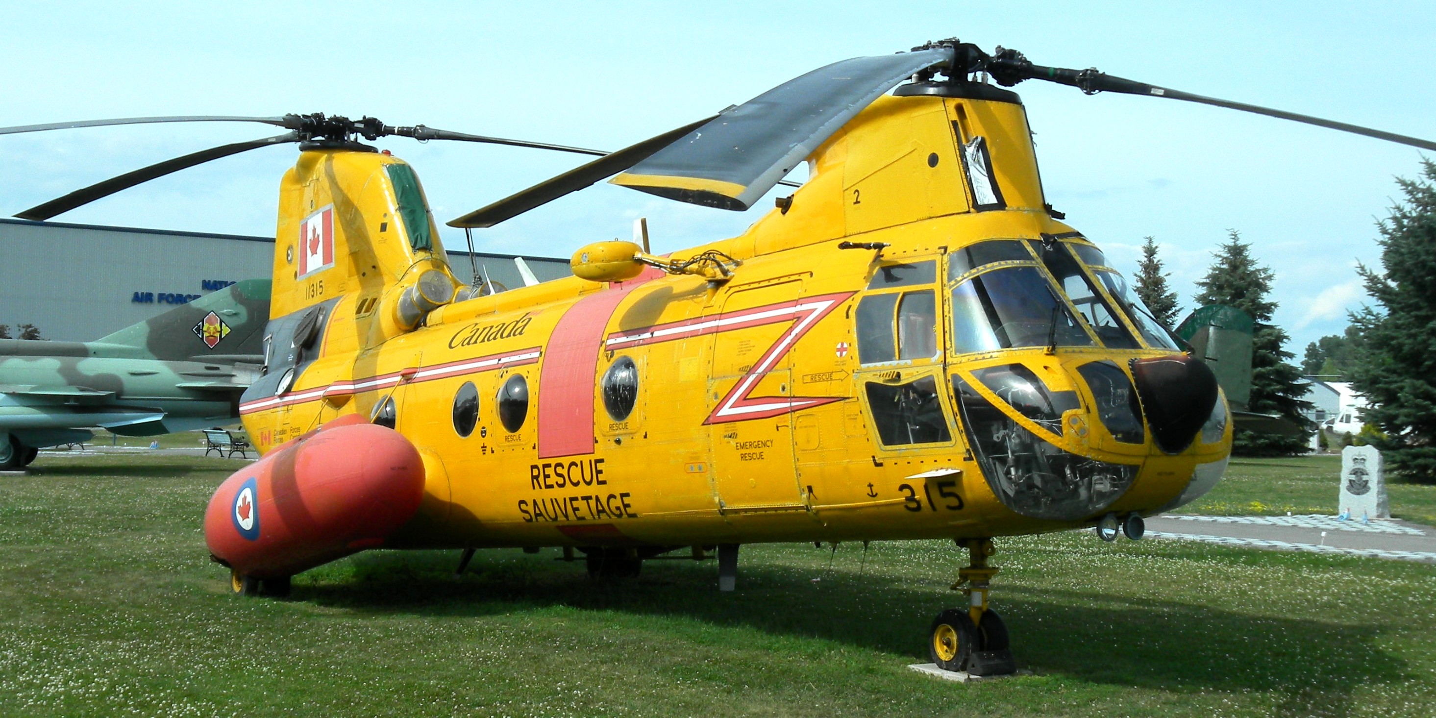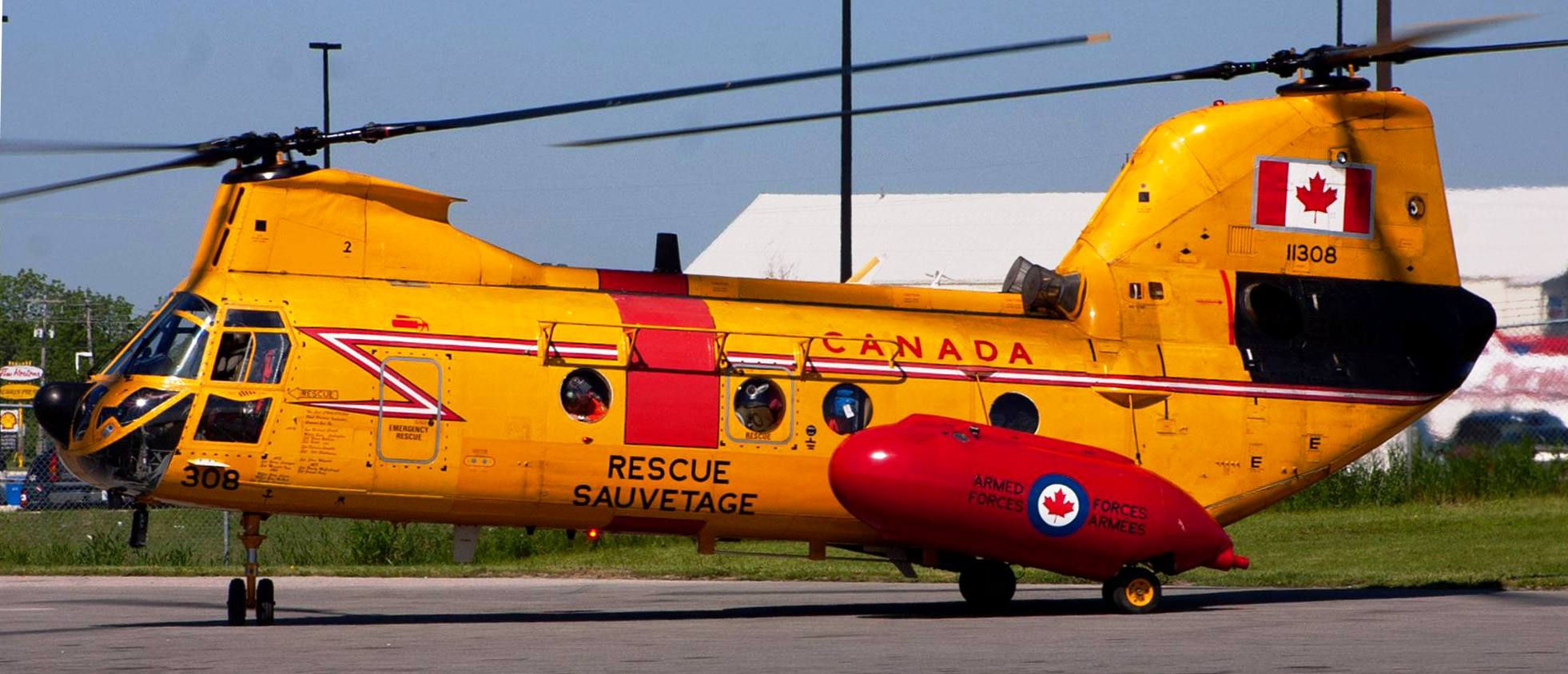 Boeing Vertol CH-113A Voyageur helicopter (Serial No. 10415), later (Serial No. 11315), 2 Oct 1976.  This helicopter is now in the National Museum of the RCAF at CFB Trenton, Ontario.  11315 was serving with No. 450 Squadron, CFB Uplands, when replaced by Chinooks in 1975.  Converted to SAR configuration Labrador 1975.  Initially operated in olive drab paint with temporary rescue markings.  Served with 424 Transport and Rescue Squadron, CFB Trenton, Ontario from October 1975.  Rescued crew of crashed Fox Moth at Toronto air show, 5 September 1976, while with 424 Sdn.  Moved with 424 Sdn. detachment to Summerside, PEI in October 1976, and then to Newfoundland by 1977.  With 413 Squadron, CFB Summerside, PEI, 1982.  With 103 Rescue Unit, CFB Gander, Nfld, 1983.  Back to No. 424 Squadron by February 1995.  Preserved at RCAF Memorial Museum, Trenton, Ontario by fall of 2005.  (RWR Walker)