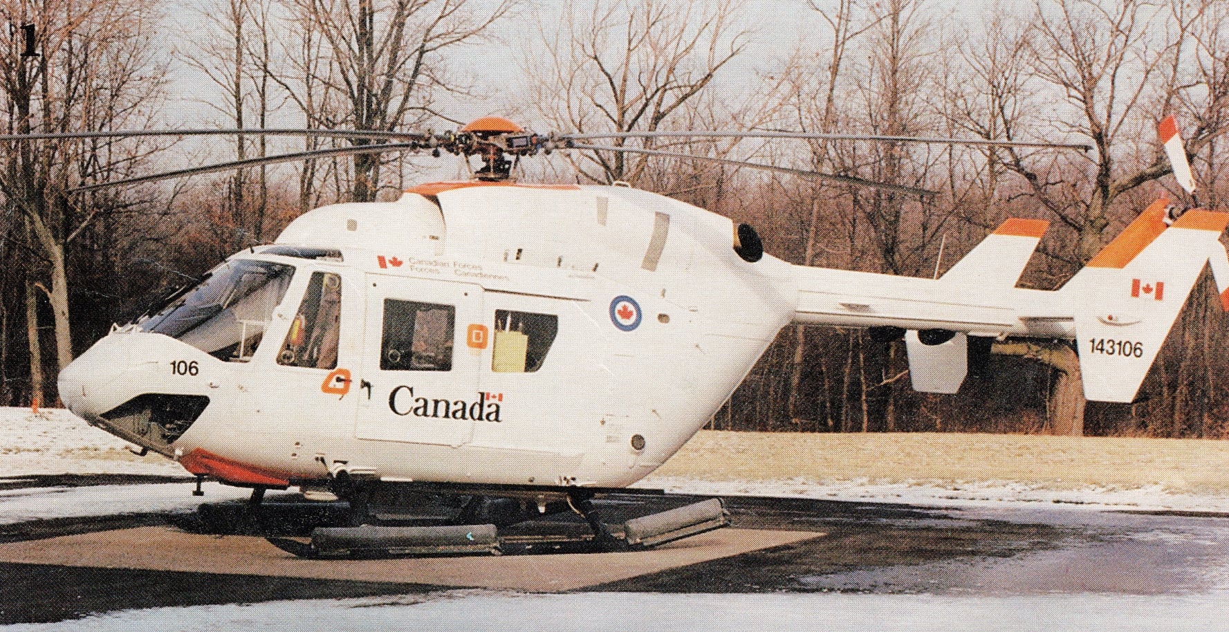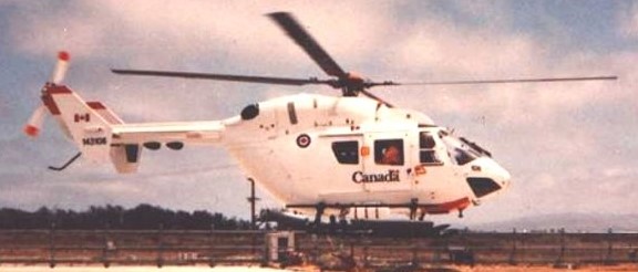 The CAF leased MBB CH-143 (Serial No. 143106), c/n 7106, BK117-3AD, registered as D-HBCA for initial production tests at Fort Erie. Registered as C-FIOM in 1990, used as demonstrator and training aircraft by MBB Canada. Still used this registration for initial tests of modifications at MBB Canada Ltd., Fort Erie, by company flight crew and Honeywell Canada test engineers. Carried Honeywell supplied nav system, and USAF supplied test equipment, in MBB Canada designed and fabricated pallets. Leased to CAF for tests of integrated nav system for NSA (New Shipborne Aircraft). Operated by CF pilots from the Aerospace Engineering and Test Establishment at CFB Cold Lake, and USAF test technicians, over land at Holloman AFB, New Mexico, and off the coast at Vandenberg AFB, California. Returned to MBB Canada Limited after lease, upgraded to BK 117-A4D by 1992. To Alc Airlift Corporation of Pitt Meadows, BC in 1993 (on lease?). To Stars Aviation of Calgary, in EMS configuration, from 1993. Latest Certificate of Registration issued on 4 June 2002. First Flight First flight in NSA testbed configuration, as C-FIOM, at Fort Erie, Ontario. (CWHM)